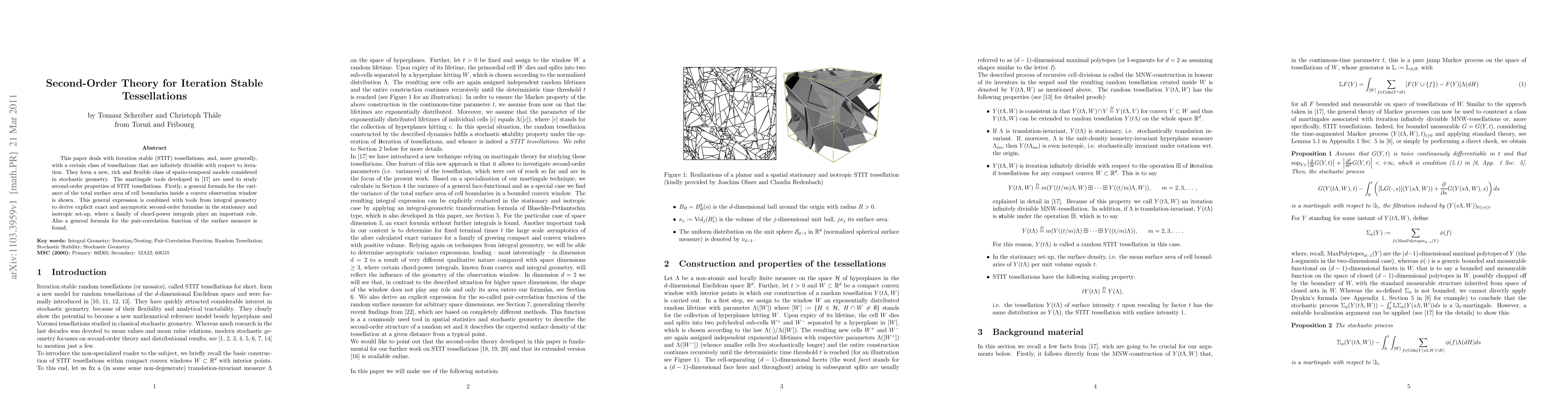 This paper introduces iteration stable tessellations (STIT) and explores their second-order properties using martingale tools. It derives a general formula for the variance of total surface area and provides explicit second-order formulae for stationary and isotropic setups, alongside a pair-correlation function for the surface measure.