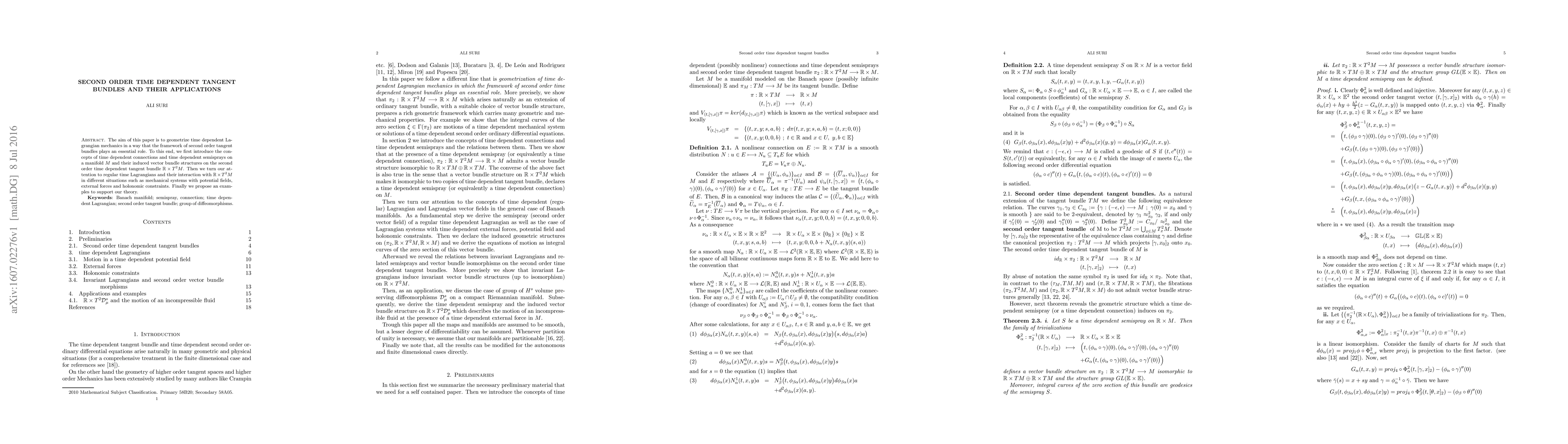 This paper develops a framework for time-dependent Lagrangian mechanics using second-order tangent bundles, enabling analysis of mechanical systems with potential fields, external forces, and holonomic constraints.