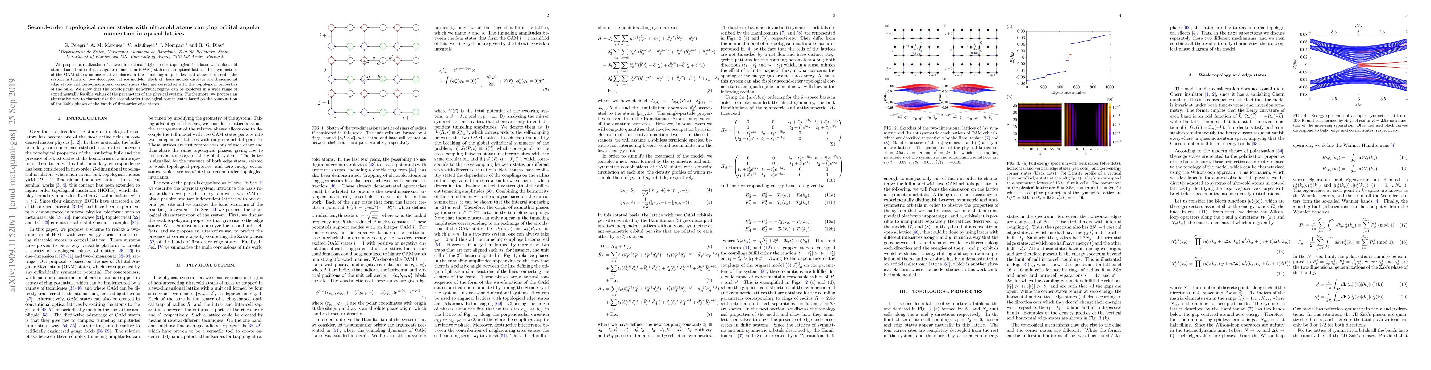 We propose a realization of a two-dimensional higher-order topological insulator with ultracold atoms loaded into orbital angular momentum (OAM) states of an optical lattice. The symmetries of the OAM states induce relative phases in the tunneling amplitudes that allow to describe the system in terms of two decoupled lattice models. Each of these models displays one-dimensional edge states and zero-dimensional corner states that are correlated with the topological properties of the bulk. We show that the topologically non-trivial regime can be explored in a wide range of experimentally feasible values of the parameters of the physical system. Furthermore, we propose an alternative way to characterize the second-order topological corner states based on the computation of the Zak's phases of the bands of first-order edge states.