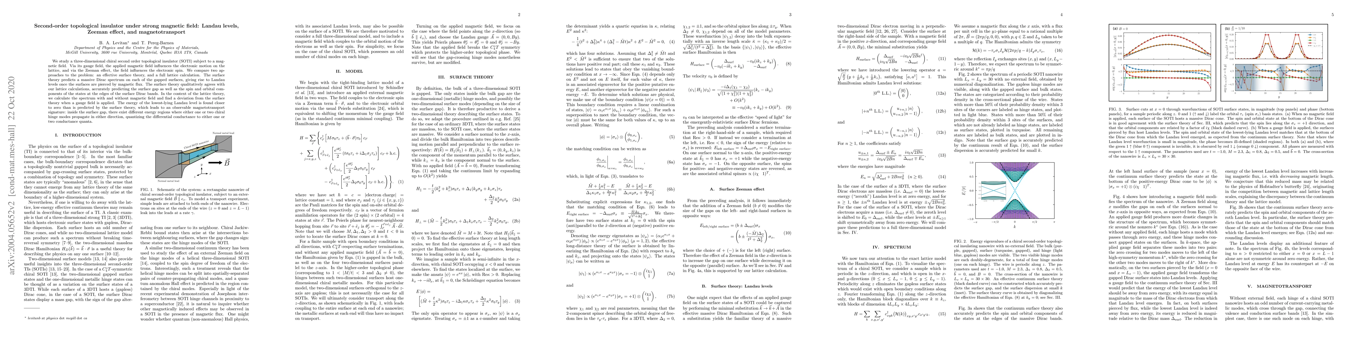We study a three-dimensional chiral second order topological insulator (SOTI) subject to a magnetic field. Via its gauge field, the applied magnetic field influences the electronic motion on the lattice, and via the Zeeman effect, the field influences the electronic spin. We compare two approaches to the problem: an effective surface theory, and a full lattice calculation. The surface theory predicts a massive Dirac spectrum on each of the gapped surfaces, giving rise to Landau levels once the surfaces are pierced by magnetic flux. The surface theory qualitatively agrees with our lattice calculations, accurately predicting the surface gap as well as the spin and orbital components of the states at the edges of the surface Dirac bands. In the context of the lattice theory, we calculate the spectrum with and without magnetic field and find a deviation from the surface theory when a gauge field is applied. The energy of the lowest-lying Landau level is found closer to zero than is predicted by the surface theory, which leads to an observable magnetotransport signature: inside the surface gap, there exist different energy regions where either one or two chiral hinge modes propagate in either direction, quantizing the differential conductance to either one or two conductance quanta.