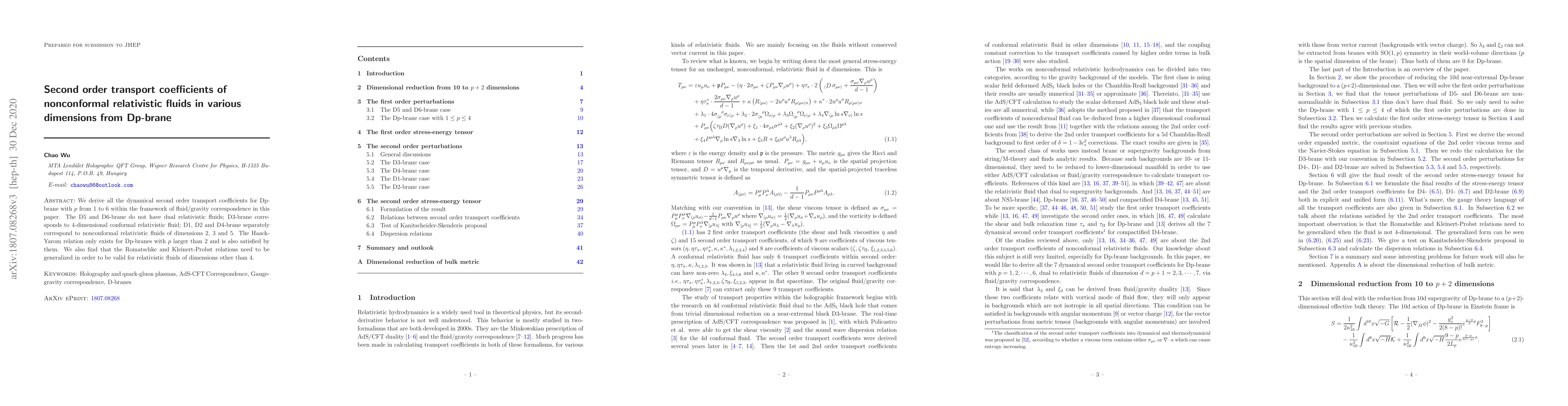 This paper derives second-order transport coefficients for various Dp-branes within the fluid/gravity correspondence, finding that Dp-branes with $p$ from 1 to 6 correspond to nonconformal relativistic fluids in dimensions 2 to 5, except for D5 and D6-branes which lack dual fluids. The study also generalizes relations for non-4D dimensions.