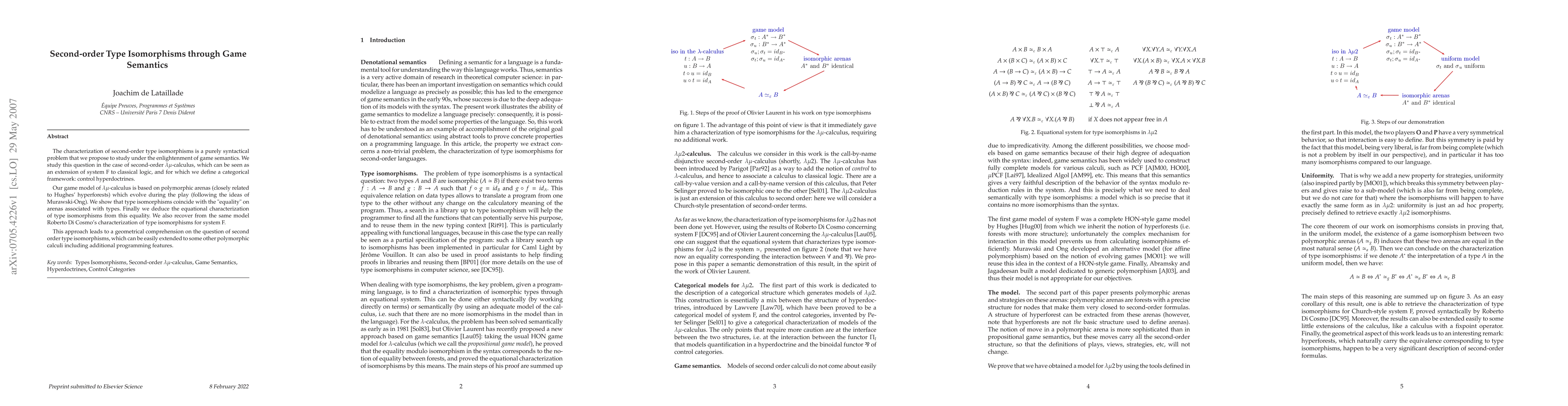 The characterization of second-order type isomorphisms is a purely syntactical problem that we propose to study under the enlightenment of game semantics. We study this question in the case of second-order λ$\mu$-calculus, which can be seen as an extension of system F to classical logic, and for which we define a categorical framework: control hyperdoctrines. Our game model of λ$\mu$-calculus is based on polymorphic arenas (closely related to Hughes' hyperforests) which evolve during the play (following the ideas of Murawski-Ong). We show that type isomorphisms coincide with the "equality" on arenas associated with types. Finally we deduce the equational characterization of type isomorphisms from this equality. We also recover from the same model Roberto Di Cosmo's characterization of type isomorphisms for system F. This approach leads to a geometrical comprehension on the question of second order type isomorphisms, which can be easily extended to some other polymorphic calculi including additional programming features.