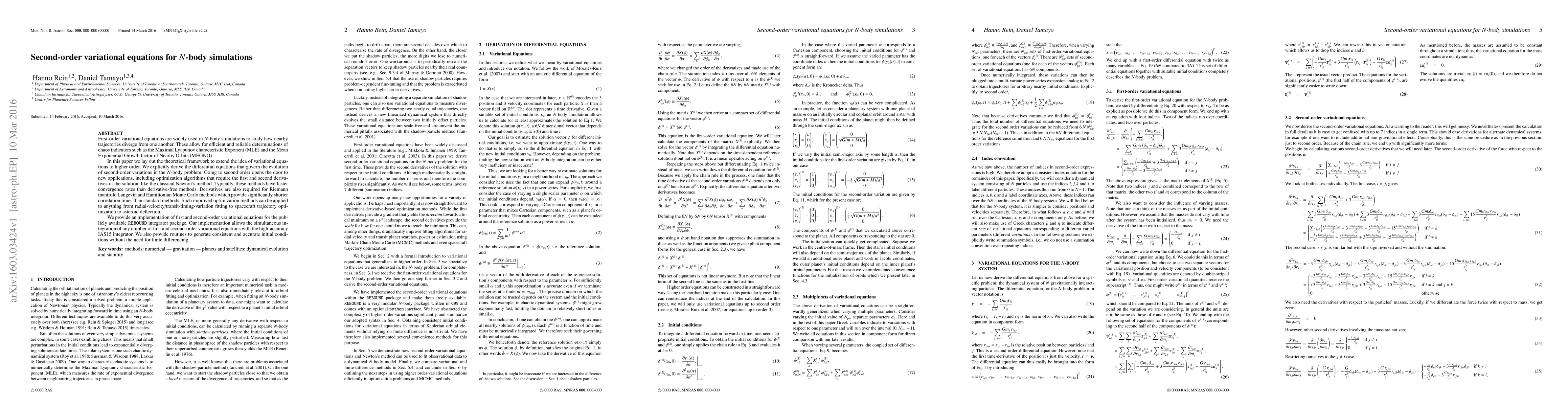 First-order variational equations are widely used in N-body simulations to study how nearby trajectories diverge from one another. These allow for efficient and reliable determinations of chaos indicators such as the Maximal Lyapunov characteristic Exponent (MLE) and the Mean Exponential Growth factor of Nearby Orbits (MEGNO). In this paper we lay out the theoretical framework to extend the idea of variational equations to higher order. We explicitly derive the differential equations that govern the evolution of second-order variations in the N-body problem. Going to second order opens the door to new applications, including optimization algorithms that require the first and second derivatives of the solution, like the classical Newton's method. Typically, these methods have faster convergence rates than derivative-free methods. Derivatives are also required for Riemann manifold Langevin and Hamiltonian Monte Carlo methods which provide significantly shorter correlation times than standard methods. Such improved optimization methods can be applied to anything from radial-velocity/transit-timing-variation fitting to spacecraft trajectory optimization to asteroid deflection. We provide an implementation of first and second-order variational equations for the publicly available REBOUND integrator package. Our implementation allows the simultaneous integration of any number of first and second-order variational equations with the high-accuracy IAS15 integrator. We also provide routines to generate consistent and accurate initial conditions without the need for finite differencing.