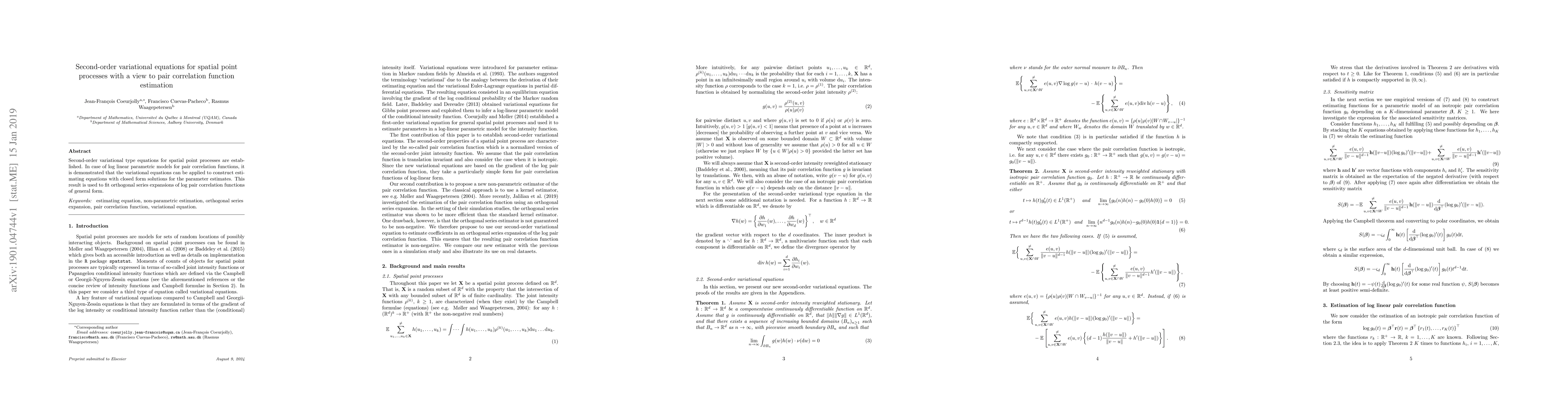 Second-order variational type equations for spatial point processes are established. In case of log linear parametric models for pair correlation functions, it is demonstrated that the variational equations can be applied to construct estimating equations with closed form solutions for the parameter estimates. This result is used to fit orthogonal series expansions of log pair correlation functions of general form.