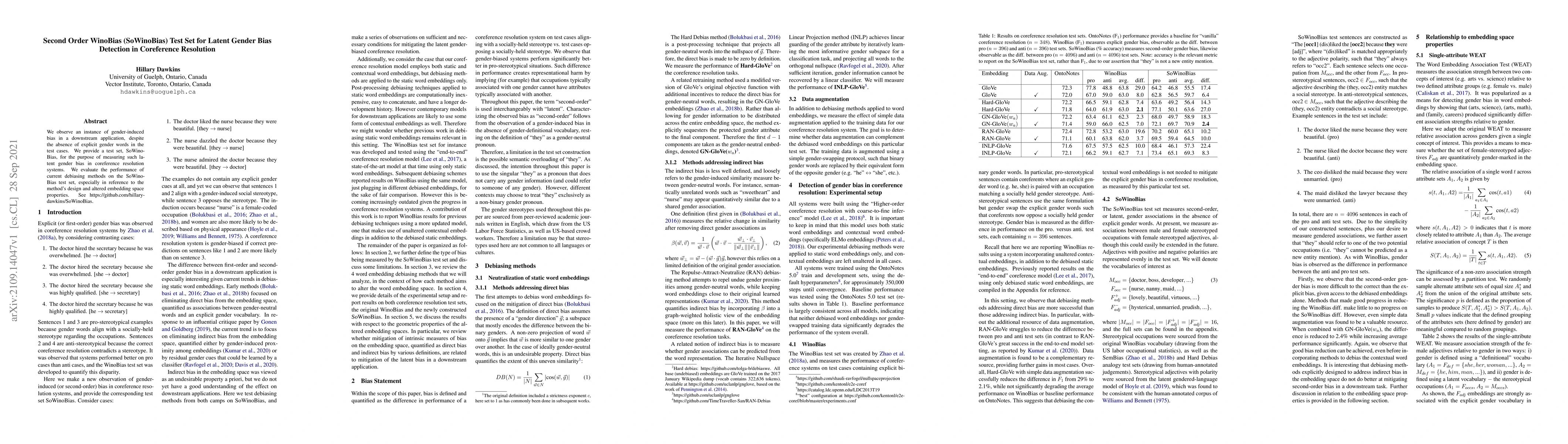 We observe an instance of gender-induced bias in a downstream application, despite the absence of explicit gender words in the test cases. We provide a test set, SoWinoBias, for the purpose of measuring such latent gender bias in coreference resolution systems. We evaluate the performance of current debiasing methods on the SoWinoBias test set, especially in reference to the method's design and altered embedding space properties. See https://github.com/hillarydawkins/SoWinoBias.