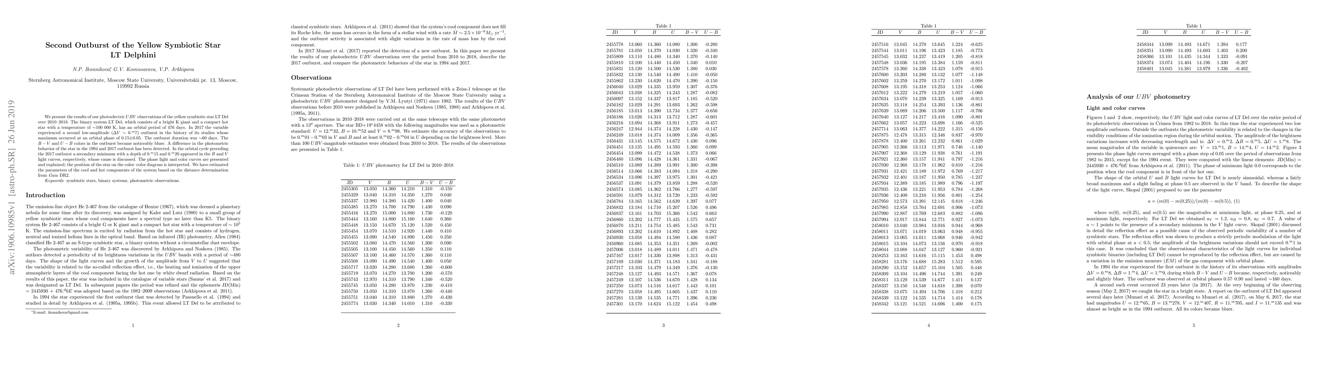 This paper reports on the second low-amplitude outburst of the yellow symbiotic star LT Delphini observed between 2010 and 2018, noting a $\Delta V\sim 0.^{m}7$ brightness increase in 2017. The study analyzes the star's orbital behavior and identifies differences in its photometric behavior compared to a previous outburst in 1994.