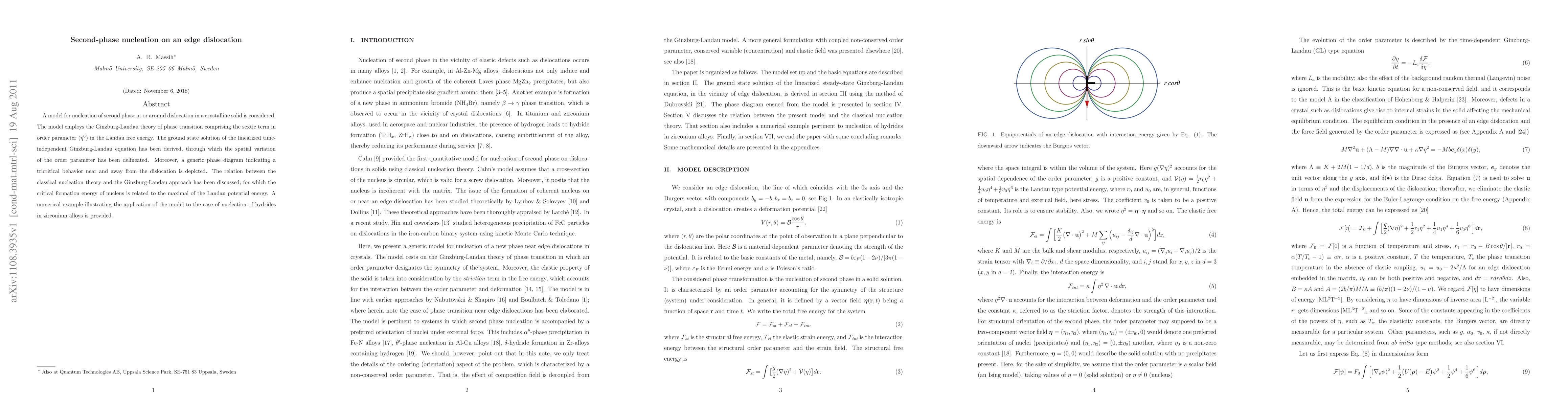 This paper models second-phase nucleation near edge dislocations in crystalline solids using Ginzburg-Landau theory, deriving a phase diagram and discussing its relation to classical nucleation theory. A numerical example demonstrates the model's application to hydride nucleation in zirconium alloys.
