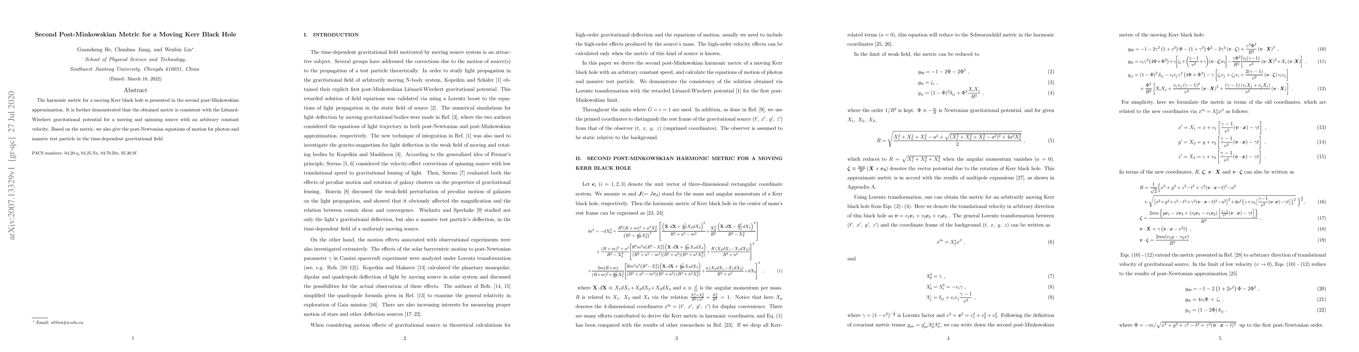 This paper presents the harmonic metric for a moving Kerr black hole in the second post-Minkowskian approximation, showing consistency with the Liénard-Wiechert gravitational potential for a spinning source. It also derives post-Newtonian equations of motion for photons and massive test particles in the resulting time-dependent gravitational field.