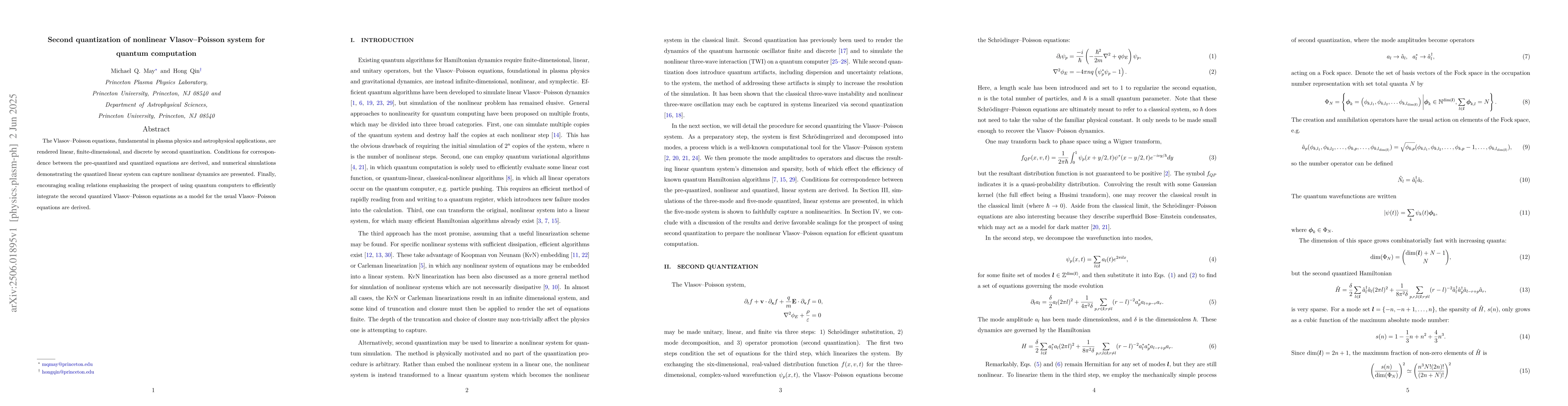 The research second-quantizes the nonlinear Vlasov-Poisson equations, deriving conditions for correspondence between pre-quantized and quantized equations, and validates the quantized linear system through numerical simulations.