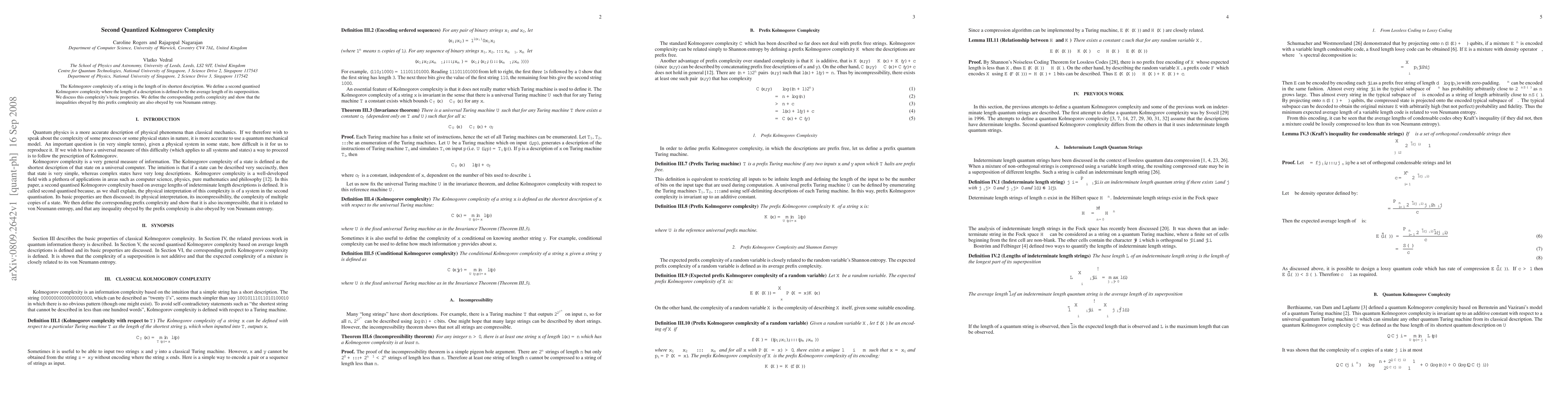 The paper introduces second quantized Kolmogorov complexity, defining it as the average length of descriptions in a superposition, and explores its fundamental properties. It also establishes a connection between this prefix complexity and von Neumann entropy, showing that similar inequalities hold.