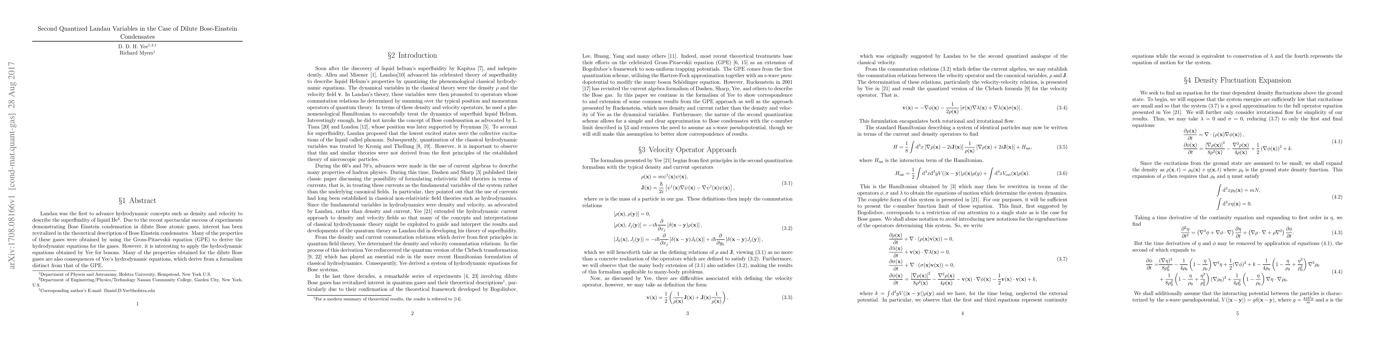 Landau was the first to advance hydrodynamic concepts such as density and velocity to describe the superfluidity of liquid He$^4$. Due to the recent spectacular success of experiments demonstrating Bose Einstein condensation in dilute Bose atomic gases, interest has been revitalized in the theoretical description of Bose Einstein condensates. Many of the properties of these gases were obtained by using the Gross-Pitaevskii equation (GPE) to derive the hydrodynamic equations for the gases. However, it is interesting to apply the hydrodynamic equations obtained by Yee for bosons. Many of the properties obtained for the dilute Bose gases are also consequences of Yee's hydrodynamic equations, which derive from a formalism distinct from that of the GPE.