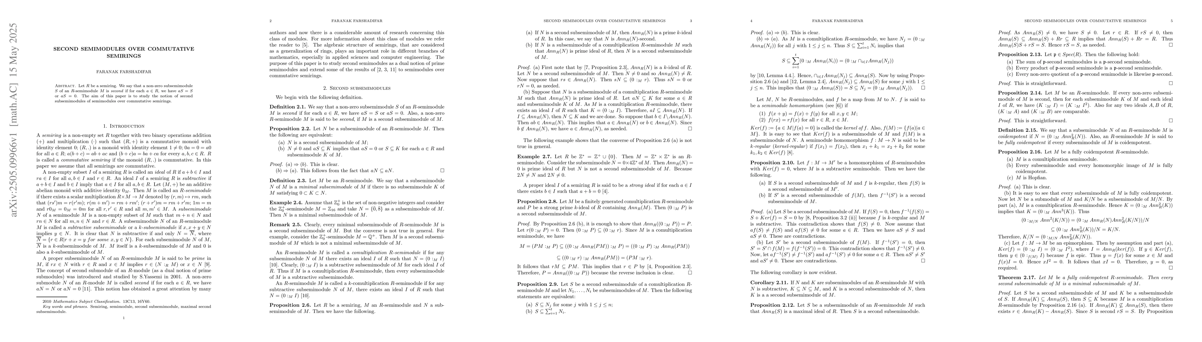 The research focuses on studying the notion of second subsemimodules of semimodules over commutative semirings, defining a subsemimodule S as 'second' if for each a in R, aS equals either S or 0.