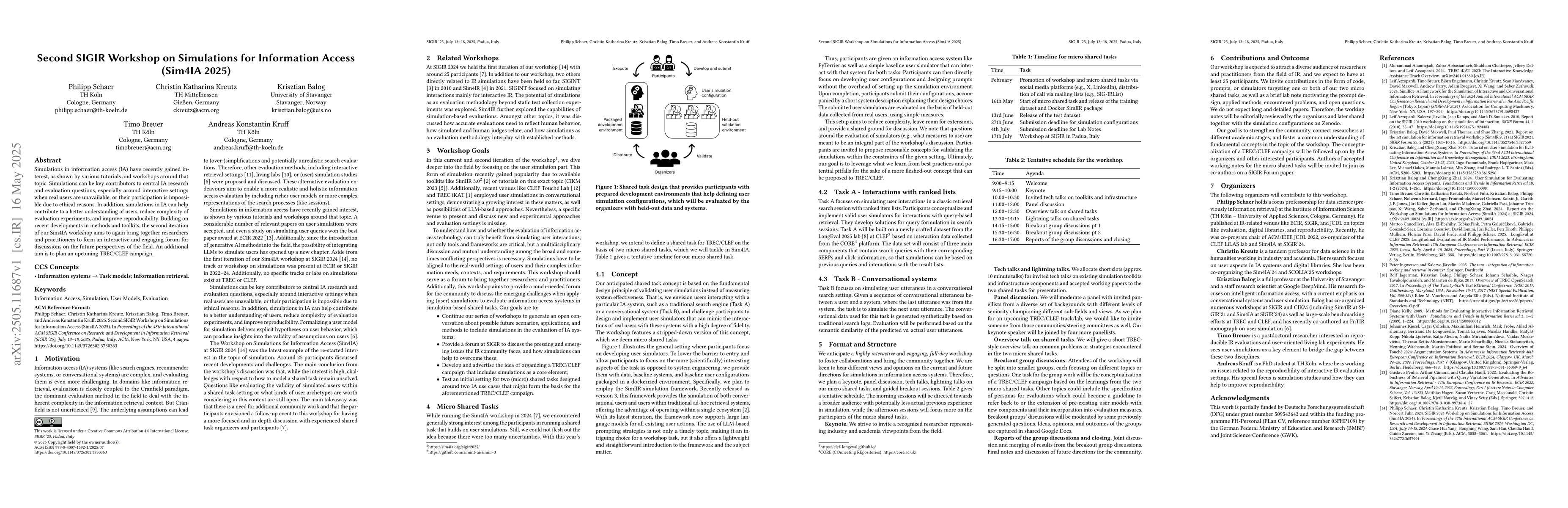 The paper describes the second Sim4IA workshop focusing on simulations in information access, aiming to gather researchers and practitioners for discussions on future perspectives and planning an upcoming TREC/CLEF campaign.