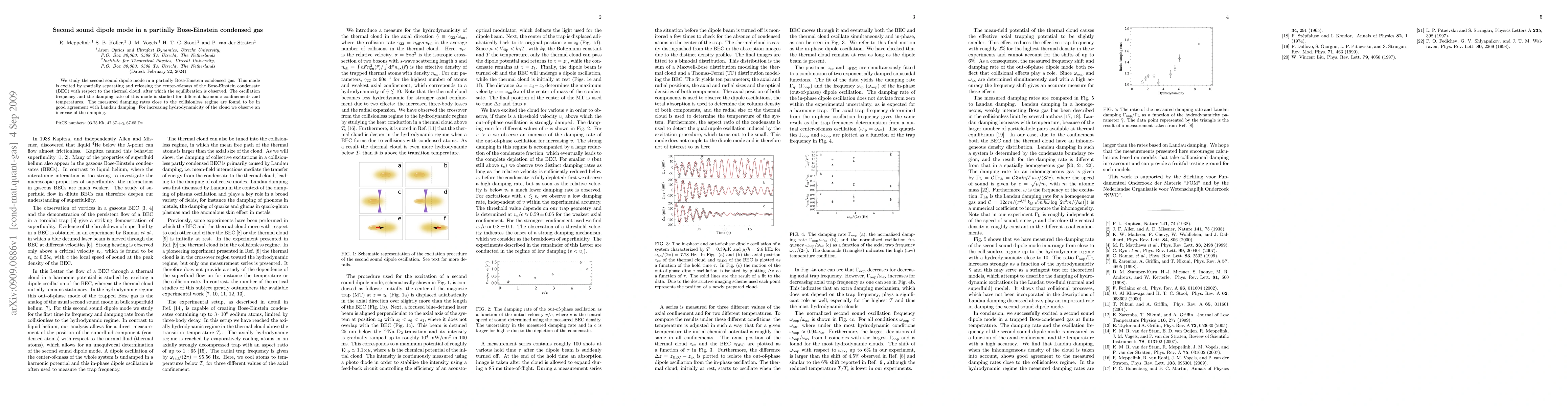 The study excites a second sound dipole mode in a partially Bose-Einstein condensed gas by spatially separating and releasing the center-of-mass of the BEC with respect to the thermal cloud, then observing equilibration. The oscillation frequency and damping rate are measured for different harmonic confinements and temperatures.