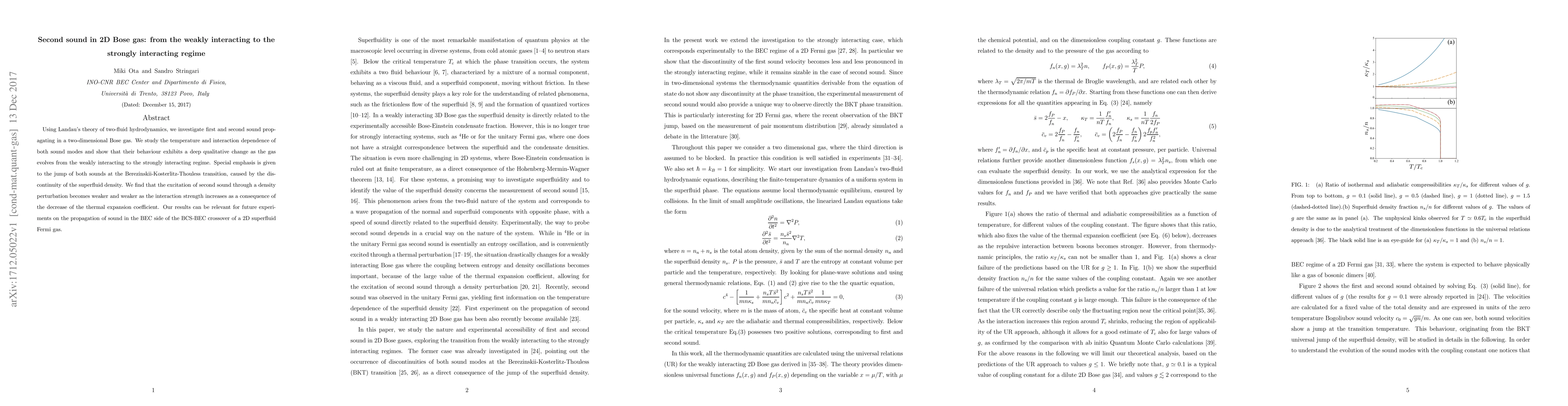 This paper investigates the first and second sound modes in a two-dimensional Bose gas, revealing a qualitative change in their behavior from weakly to strongly interacting regimes. The study highlights the impact of the Berezinskii-Kosterlitz-Thouless transition on sound propagation and notes a diminishing effect of second sound excitation with increasing interaction strength.