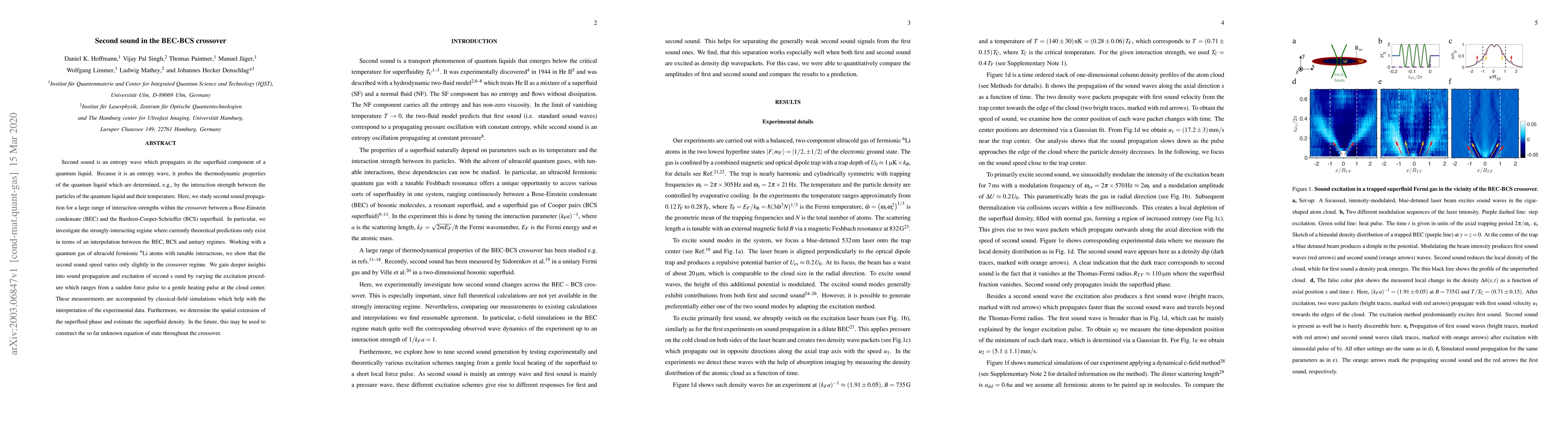 This paper investigates second sound propagation in a quantum gas of ultracold fermionic atoms across the BEC-BCS crossover, revealing slight variations in second sound speed. The study provides insights into sound excitation methods and the superfluid density, potentially aiding in constructing the unknown equation of state throughout the crossover.