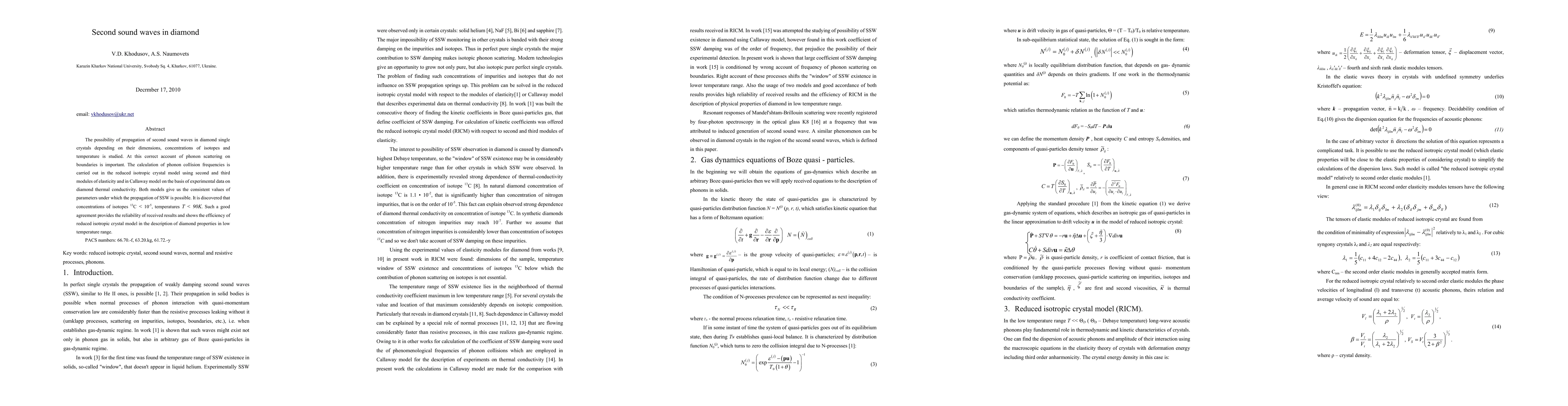 The possibility of propagation of second sound waves in diamond single crystals depending on their dimensions, concentrations of isotopes and temperature is studied. At this correct account of phonon scattering on boundaries is important. The calculation of phonon collision frequencies is carried out in the reduced isotropic crystal model using second and third modules of elasticity and in Callaway model on the basis of experimental data on diamond thermal conductivity. Both models give us the consistent values of parameters under which the propagation of SSW is possible. It is discovered that concentrations of isotopes 13C < 10-5, temperatures T < 90K. Such a good agreement provides the reliability of received results and shows the efficiency of reduced isotropic crystal model in the description of diamond properties in low temperature range.