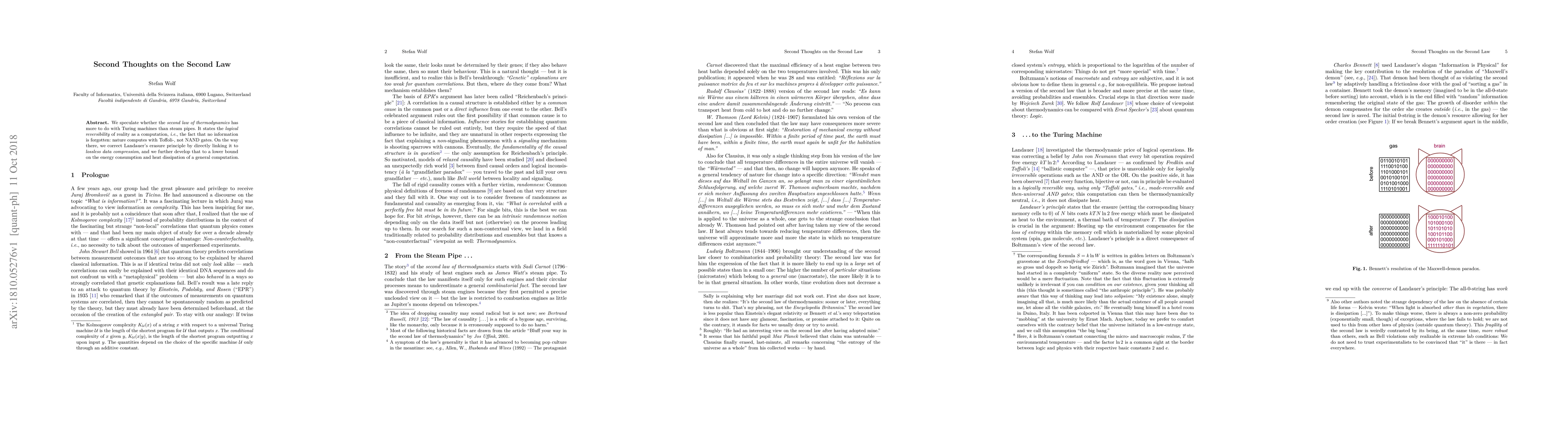 We speculate whether the second law of thermodynamics has more to do with Turing machines than steam pipes. It states the logical reversibility of reality as a computation, i.e., the fact that no information is forgotten: nature computes with Toffoli-, not NAND gates. On the way there, we correct Landauer's erasure principle by directly linking it to lossless data compression, and we further develop that to a lower bound on the energy consumption and heat dissipation of a general computation.