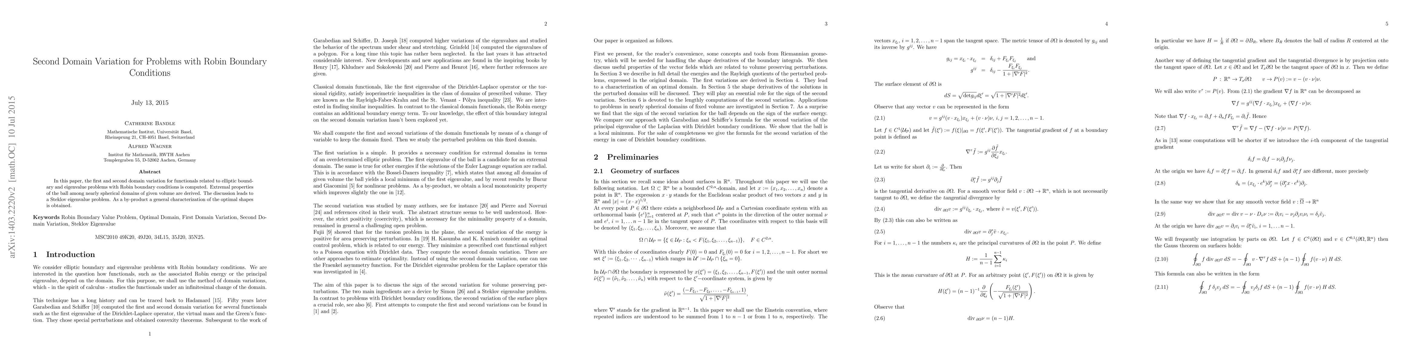 In this paper the first and second domain variation for functionals related to elliptic boundary and eigenvalue problems with Robin boundary conditions is computed. Minimality and maximality properties of the ball among nearly circular domains of given volume are derived. The discussion leads to the investigation of the eigenvalues of a Steklov eigenvalue problem. As a byproduct a general characterization of the optimal shapes is obtained.