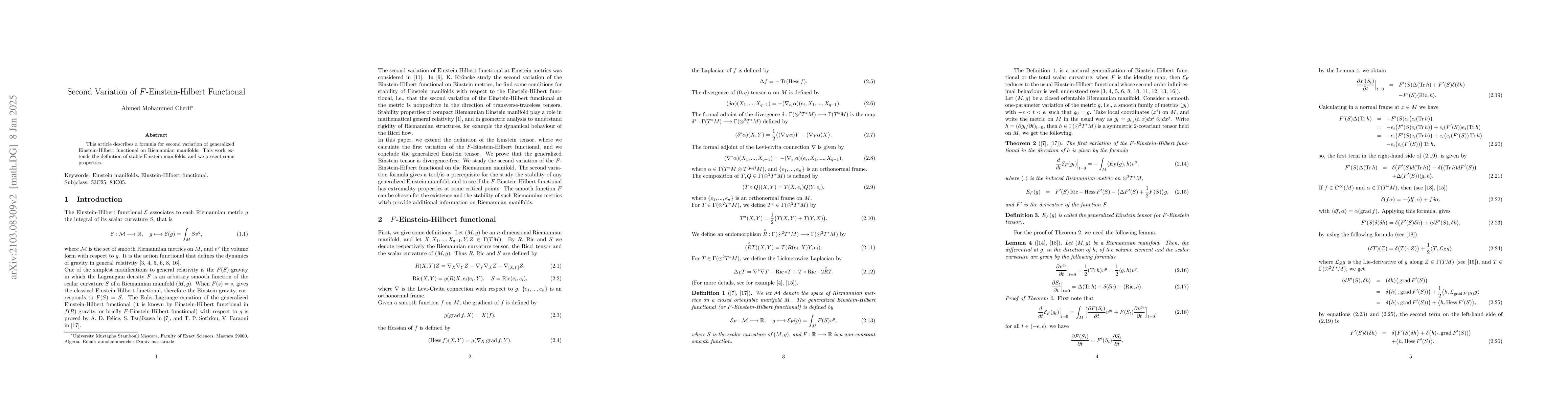 This paper introduces a formula for calculating second variation of the Einstein-Hilbert functional on Riemannian manifolds, with implications for understanding curvature properties.