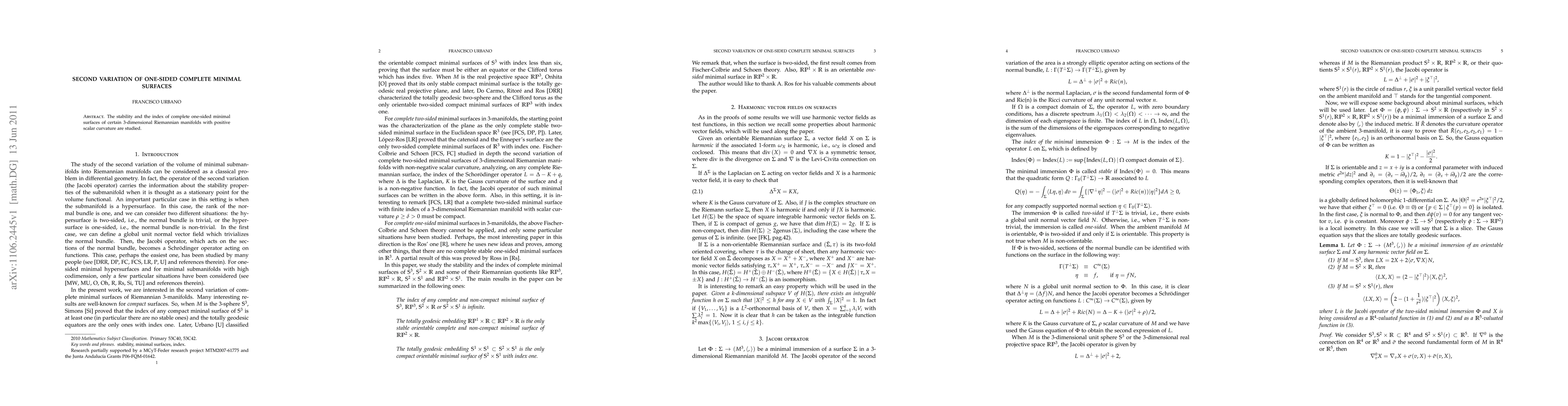 Summary: This paper investigates the stability and index of complete one-sided minimal surfaces within three-dimensional Riemannian manifolds characterized by positive scalar curvature, focusing on their geometric properties.