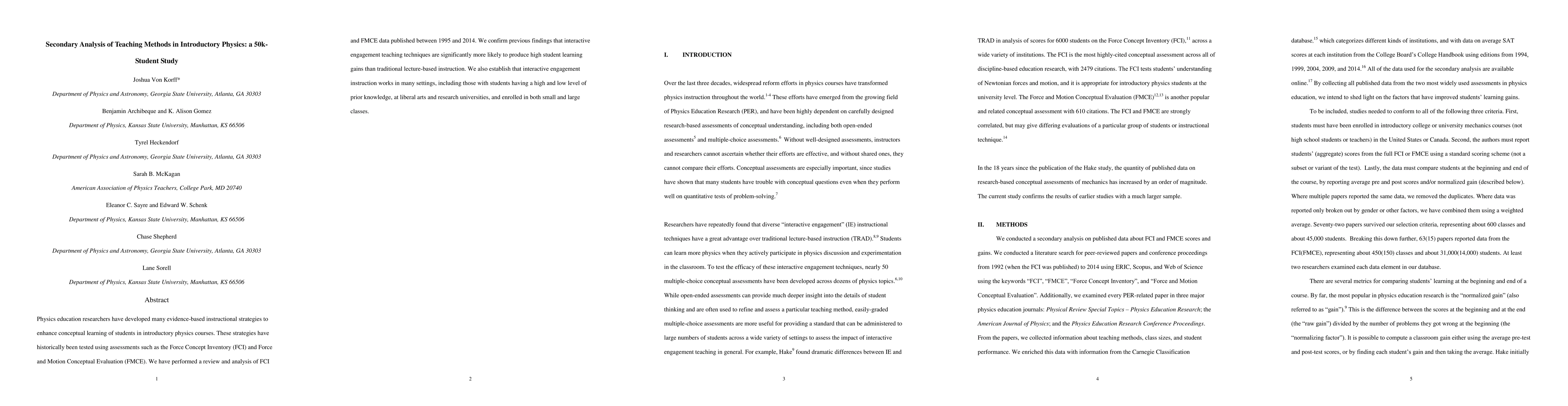 Physics education researchers have developed many evidence-based instructional strategies to enhance physics students' conceptual learning. These strategies have historically been tested using assessments such as the Force Concept Inventory (FCI) and Force and Motion Conceptual Evaluation (FMCE). We have performed a review and analysis of FCI and FMCE data published between 1995 and 2014. We confirm previous findings that interactive engagement teaching techniques are significantly more likely to produce high student learning gains than traditional lecture-based instruction. We also establish that interactive engagement instruction works in many settings, including for students with a high and low level of prior knowledge, for liberal arts and research universities, and for small and large class sizes.