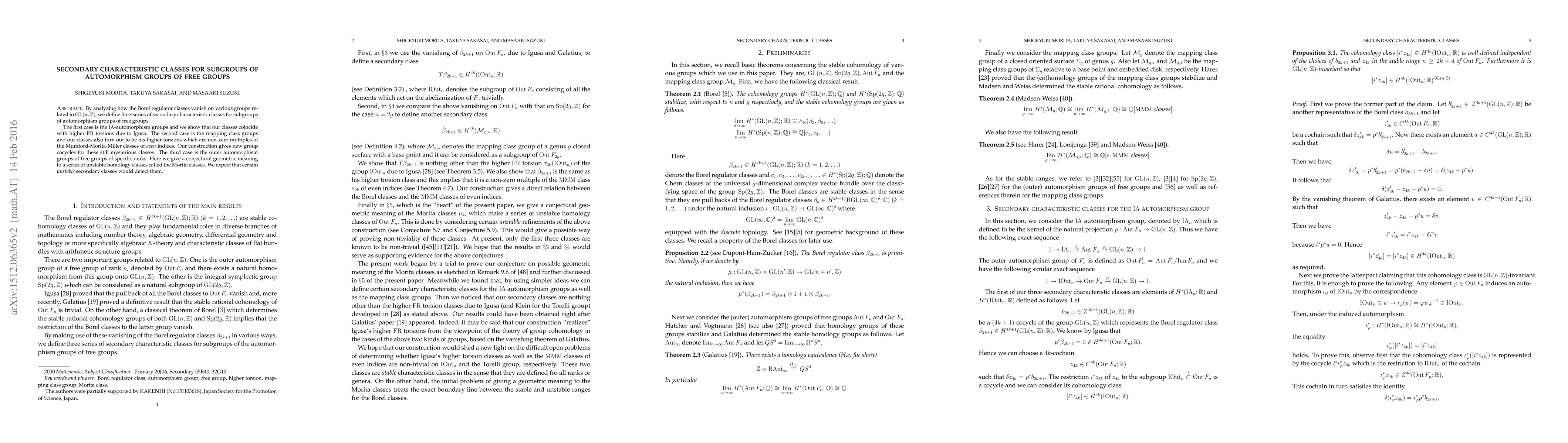 By analyzing how the Borel regulator classes vanish on various groups related to $\mathrm{GL}(n,\mathrm{Z})$, we define three series of secondary characteristic classes for subgroups of automorphism groups of free groups. The first case is the $\mathrm{IA}$-automorphism groups and we show that our classes coincide with higher $\mathrm{FR}$ torsions due to Igusa. The second case is the mapping class groups and our classes also turn out to be his higher torsions which are non-zero multiples of the Mumford-Morita-Miller classes of even indices. Our construction gives new group cocycles for these still mysterious classes. The third case is the outer automorphism groups of free groups of specific ranks. Here we give a conjectural geometric meaning to a series of unstable homology classes called the Morita classes. We expect that certain unstable secondary classes would detect them.