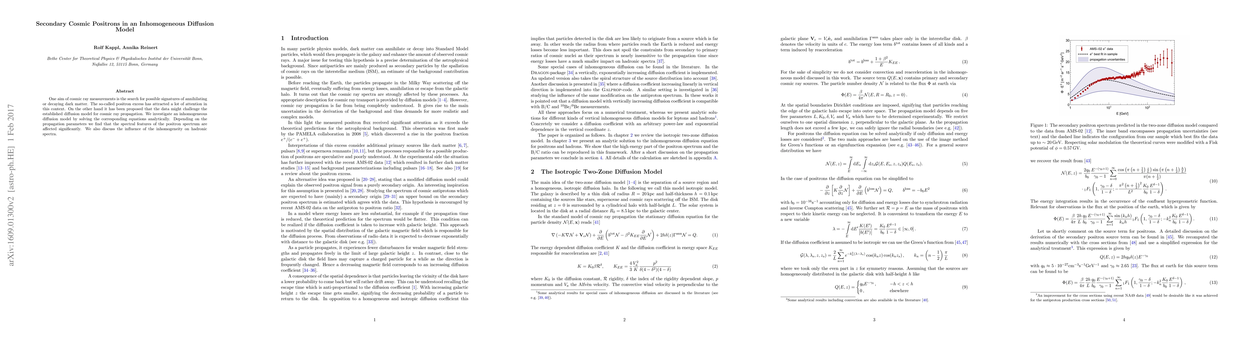 One aim of cosmic ray measurements is the search for possible signatures of annihilating or decaying dark matter. The so-called positron excess has attracted a lot of attention in this context. On the other hand it has been proposed that the data might challenge the established diffusion model for cosmic ray propagation. We investigate an inhomogeneous diffusion model by solving the corresponding equations analytically. Depending on the propagation parameters we find that the spectral features of the positron spectrum are affected significantly. We also discuss the influence of the inhomogeneity on hadronic spectra.