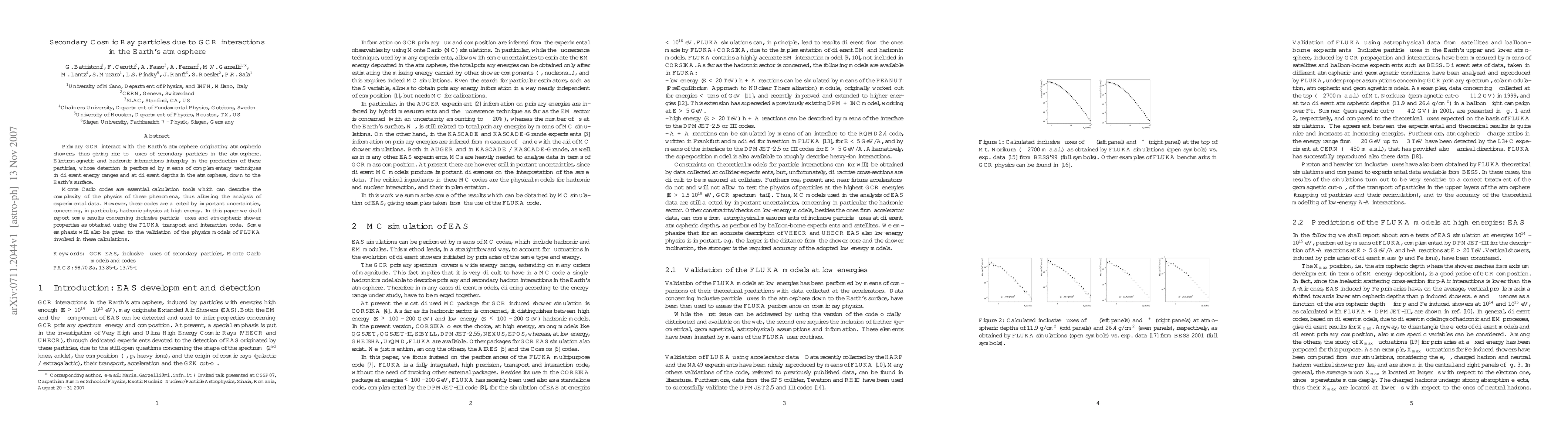 Primary GCR interact with the Earth's atmosphere originating atmospheric showers, thus giving rise to fluxes of secondary particles in the atmosphere. Electromagnetic and hadronic interactions interplay in the production of these particles, whose detection is performed by means of complementary techniques in different energy ranges and at different depths in the atmosphere, down to the Earth's surface. Monte Carlo codes are essential calculation tools which can describe the complexity of the physics of these phenomena, thus allowing the analysis of experimental data. However, these codes are affected by important uncertainties, concerning, in particular, hadronic physics at high energy. In this paper we shall report some results concerning inclusive particle fluxes and atmospheric shower properties as obtained using the FLUKA transport and interaction code. Some emphasis will also be given to the validation of the physics models of FLUKA involved in these calculations.
