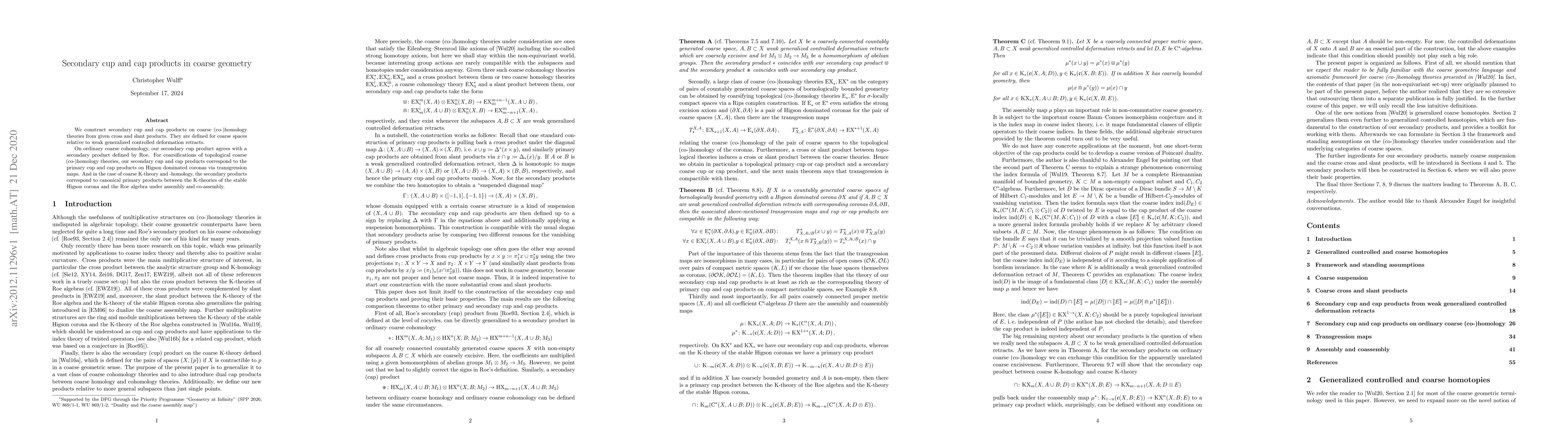This paper constructs secondary cup and cap products for coarse (co)homology theories, establishing their agreement with Roe's secondary product in ordinary coarse cohomology and linking them to primary products in coarsified topological theories and $\mathrm{K}$-theory. The products are defined relative to weak generalized controlled deformation retracts.