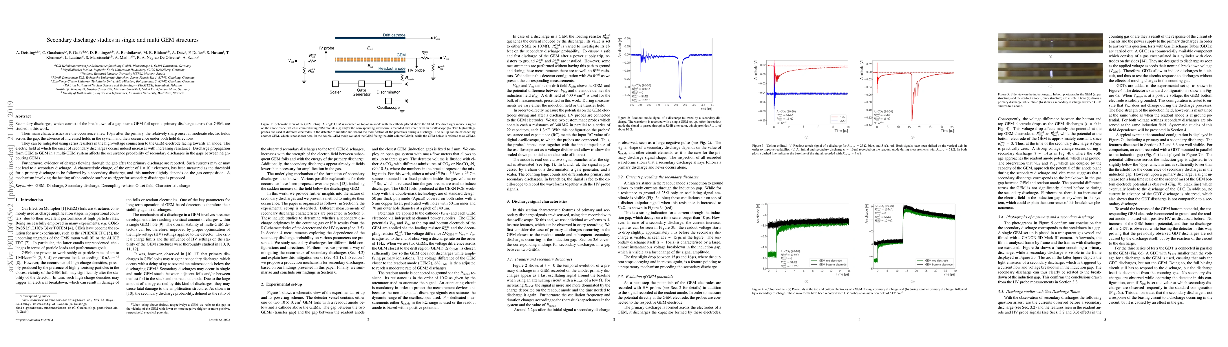 This research investigates secondary discharges in single and multi GEM (Gas Electron Multiplier) structures, noting they occur a few $10\,\mu \textrm{s}$ after primary discharges and can be mitigated by series resistors. The study also finds that secondary discharges depend on gas composition and propose a mechanism involving cathode surface heating.