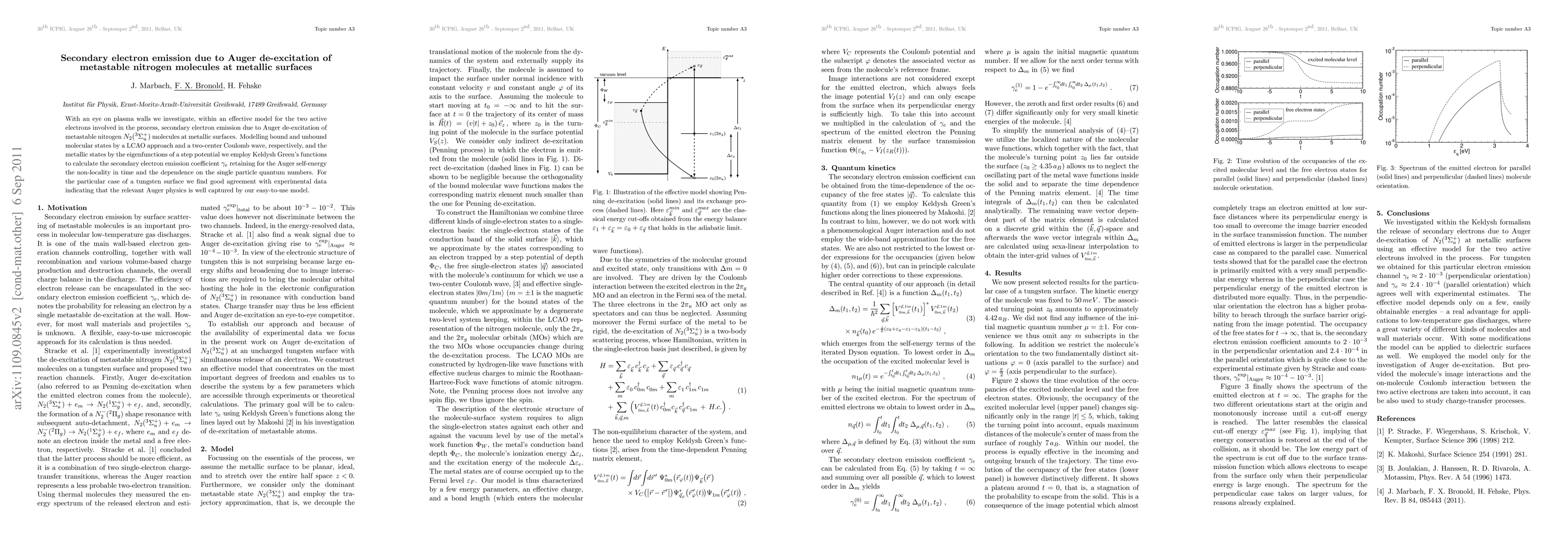 This paper investigates secondary electron emission from metastable nitrogen molecules on metallic surfaces, focusing on the Auger de-excitation process. The authors use an effective model and Keldysh Green's functions to calculate the emission coefficient, finding good agreement with experimental data for a tungsten surface.