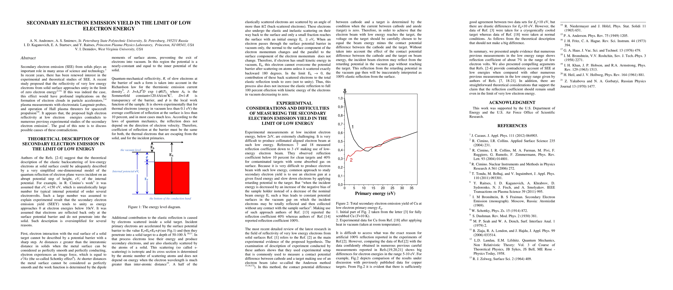 Secondary electron emission (SEE) from solids plays an important role in many areas of science and technology.1 In recent years, there has been renewed interest in the experimental and theoretical studies of SEE. A recent study proposed that the reflectivity of very low energy electrons from solid surface approaches unity in the limit of zero electron energy2,3,4, If this was indeed the case, this effect would have profound implications on the formation of electron clouds in particle accelerators,2-4 plasma measurements with electrostatic Langmuir probes, and operation of Hall plasma thrusters for spacecraft propulsion5,6. It appears that, the proposed high electron reflectivity at low electron energies contradicts to numerous previous experimental studies of the secondary electron emission7. The goal of this note is to discuss possible causes of these contradictions.