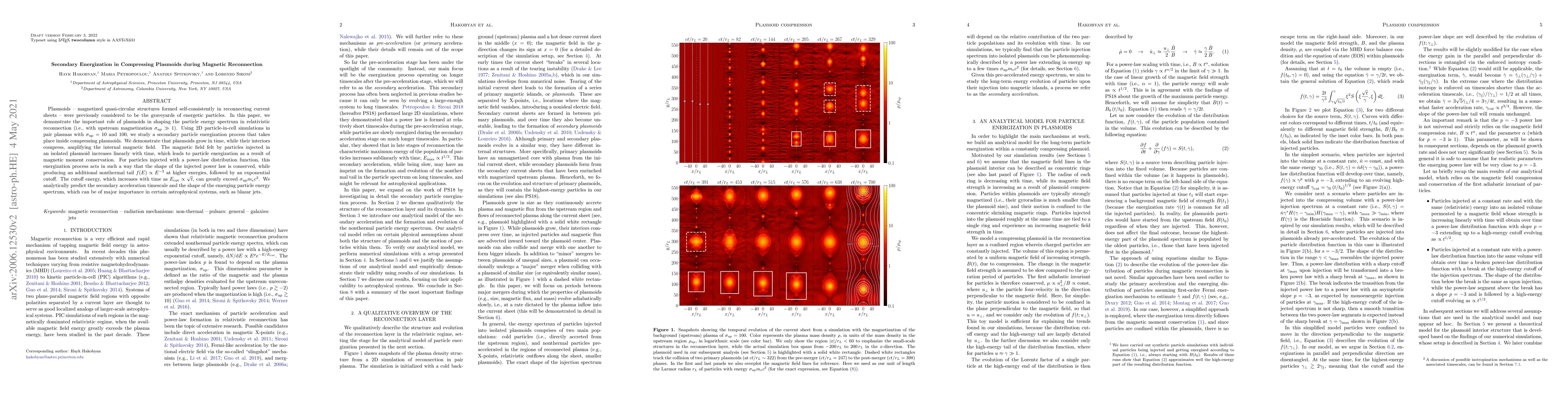 This paper investigates secondary particle energization within compressing plasmoids in relativistic magnetic reconnection, revealing that plasmoids can amplify internal magnetic fields and produce a non-thermal tail in particle energy spectra, with a cutoff energy scaling as $\sqrt{t}$. The findings are significant for understanding particle acceleration in astrophysical systems like blazar jets.