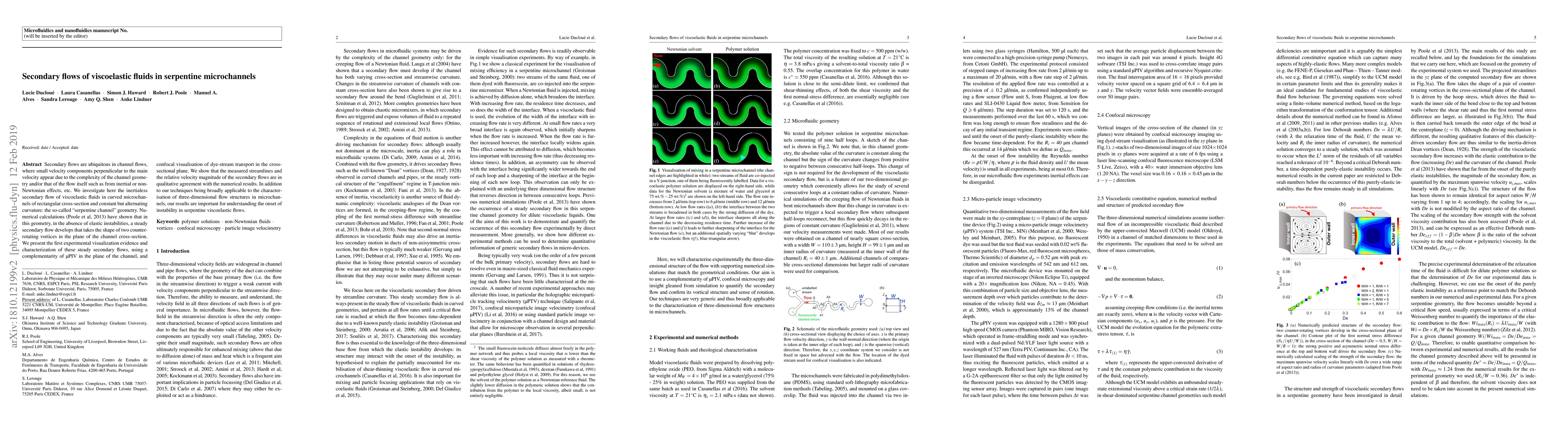 This paper investigates the secondary flow of viscoelastic fluids in serpentine microchannels, presenting experimental evidence of steady secondary flows characterized by two counter-rotating vortices. The study combines microPIV and confocal visualization to validate numerical predictions, highlighting the importance for understanding flow instabilities.