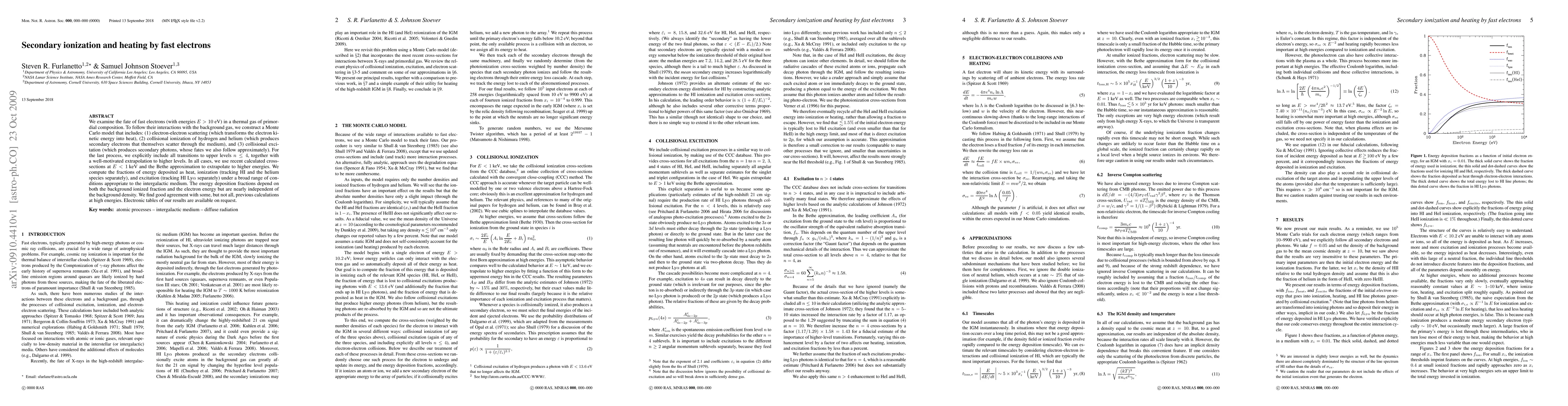 This paper uses a Monte Carlo model to study the interactions of fast electrons in primordial gas, focusing on secondary ionization, heating, and excitation processes. The results show energy deposition fractions dependent on ionized fraction and electron energy, but nearly independent of gas density, with mixed agreement with previous high-energy calculations.