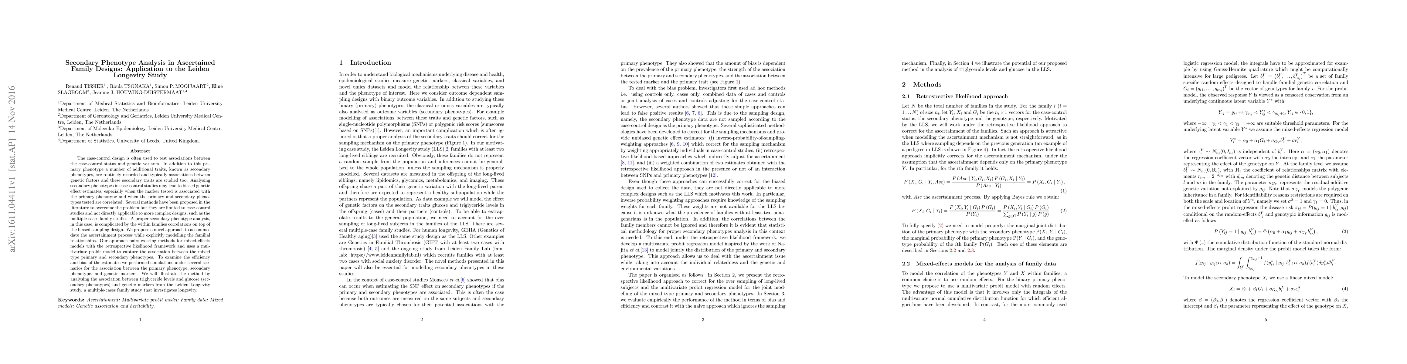 This paper proposes a novel method for analyzing secondary phenotypes in multiple-cases family studies, addressing biases due to ascertainment and familial correlations. The approach combines mixed-effects models with a multivariate probit model, demonstrated through simulations and application to the Leiden Longevity Study to examine associations between triglyceride levels, glucose, and genetic markers.