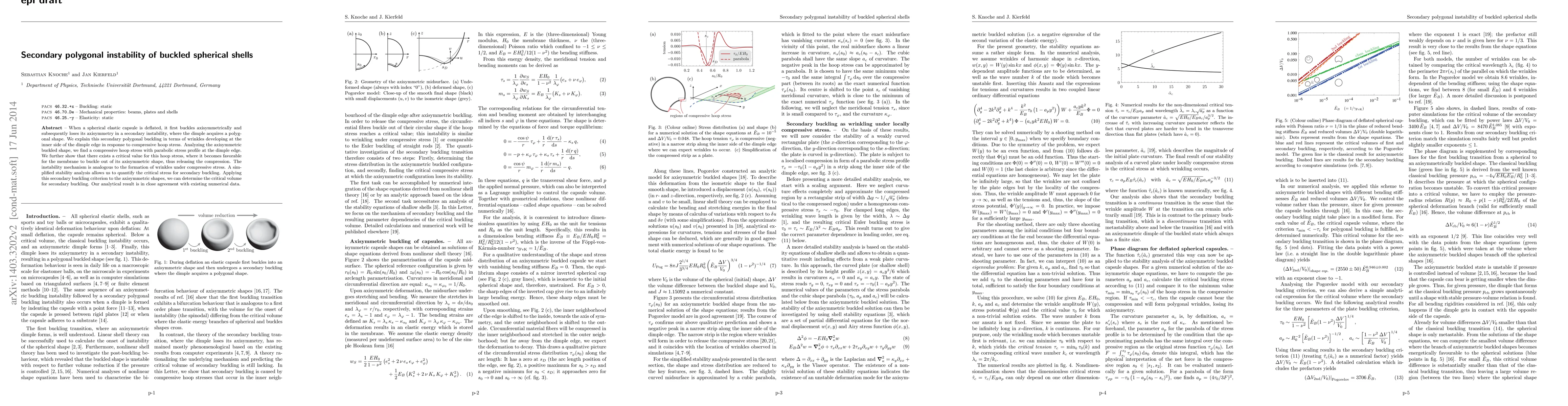 This paper investigates the secondary polygonal instability of buckled spherical shells, explaining the transition from axisymmetric to polygonal buckling due to compressive hoop stress-induced wrinkles at the dimple edge. The study provides a critical stress value for this transition and correlates it with the critical volume for the secondary buckling phenomenon, with analytical results matching numerical data.