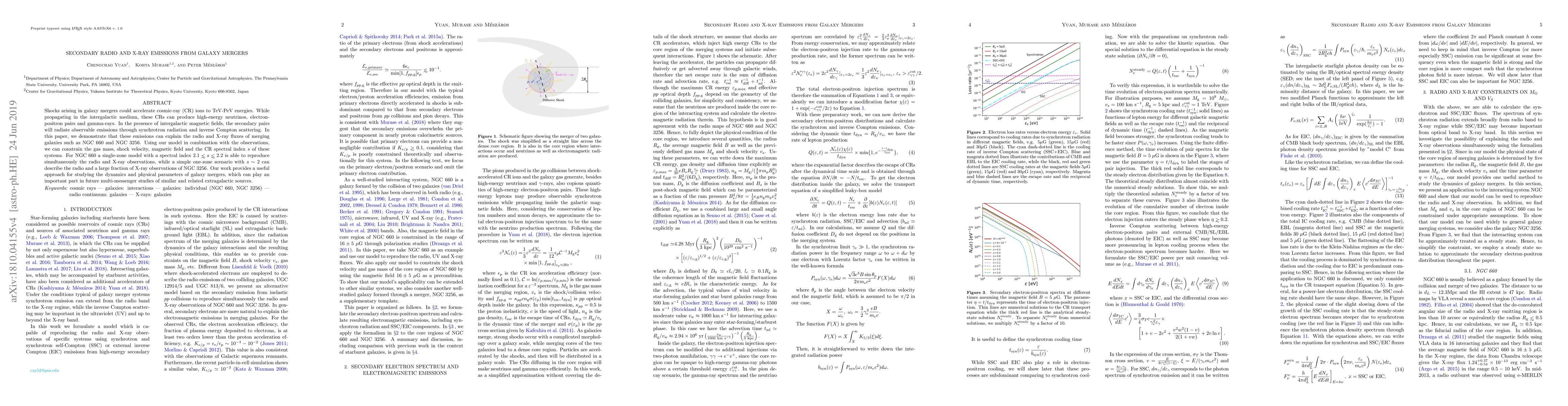 Shocks arising in galaxy mergers could accelerate cosmic-ray (CR) ions to TeV-PeV energies. While propagating in the intergalactic medium, these CRs can produce high-energy neutrinos, electron-positron pairs and gamma-rays. In the presence of intergalactic magnetic fields, the secondary pairs will radiate observable emissions through synchrotron radiation and inverse Compton scattering. In this paper, we demonstrate that these emissions can explain the radio and X-ray fluxes of merging galaxies such as NGC 660 and NGC 3256. Using our model in combination with the observations, we can constrain the gas mass, shock velocity, magnetic field and the CR spectral index $s$ of these systems. For NGC 660 a single-zone model with a spectral index $2.1\lesssim s\lesssim2.2$ is able to reproduce simultaneously the radio and X-ray observations, while a simple one-zone scenario with $s\sim2$ can describe the radio and a large fraction of X-ray observations of NGC 3256. Our work provides a useful approach for studying the dynamics and physical parameters of galaxy mergers, which can play an important part in future multi-messenger studies of similar and related extragalactic sources.