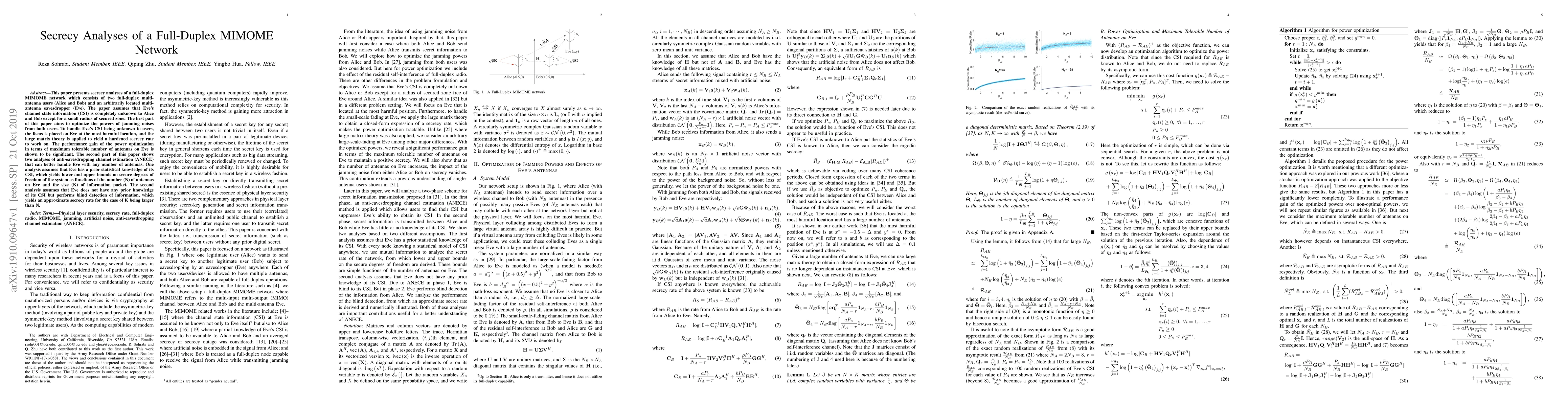 This paper analyzes a full-duplex MIMOME network to optimize power for jamming noises and estimate secure channel rates with varying numbers of Eve's antennas, improving anti-eavesdropping capabilities.