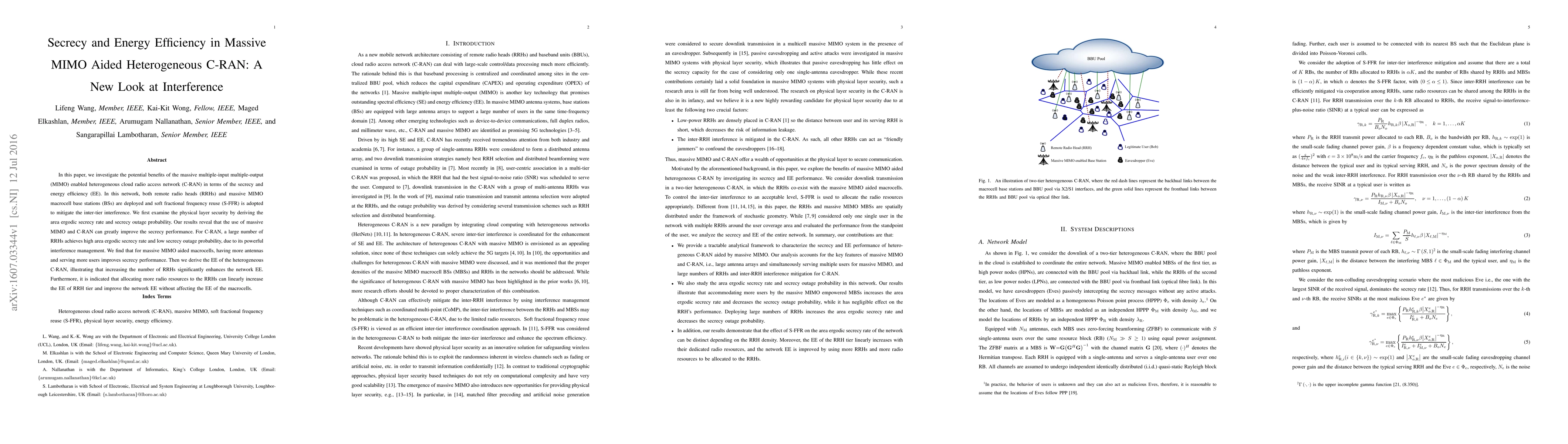 This paper explores the benefits of massive MIMO in a heterogeneous C-RAN setup for enhancing secrecy performance and energy efficiency. It finds that massive MIMO and C-RAN significantly improve physical layer security and energy efficiency, with more antennas and radio resources allocation boosting both metrics.