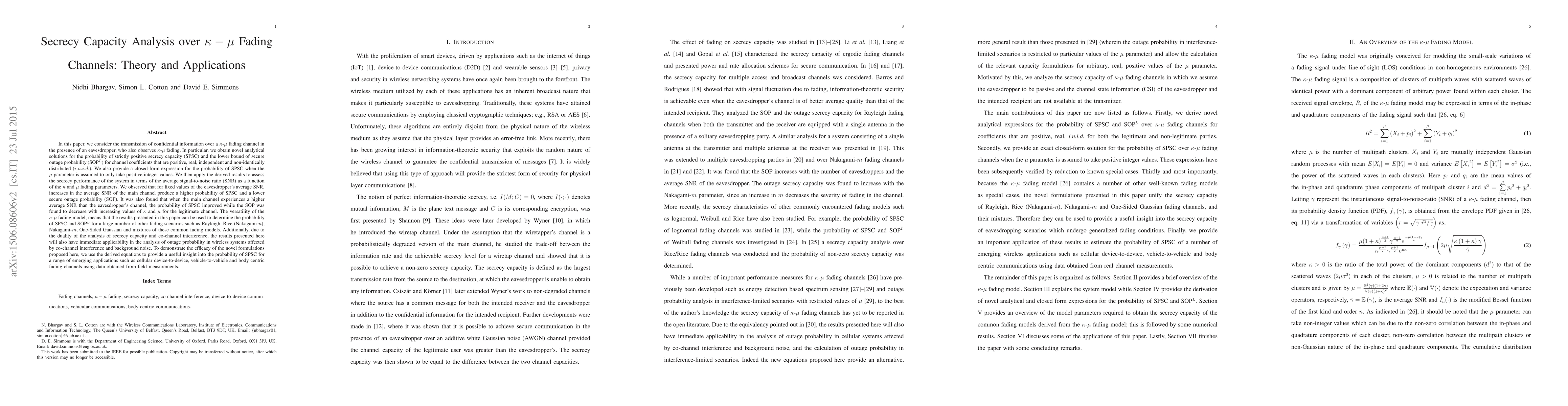 This paper analyzes the secrecy capacity over $\kappa$-$\mu$ fading channels, deriving analytical solutions for the probability of strictly positive secrecy capacity and secure outage probability. The results show that higher main channel SNR improves secrecy performance while reducing secure outage probability, with broad applicability to various fading models and co-channel interference analysis.