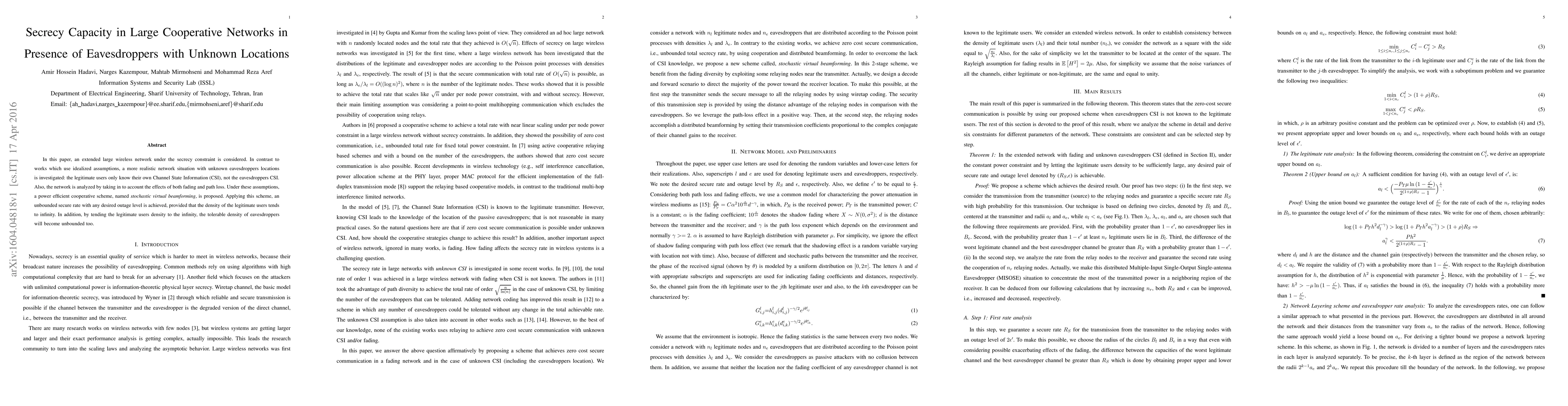 In this paper, an extended large wireless network under the secrecy constraint is considered. In contrast to works which use idealized assumptions, a more realistic network situation with unknown eavesdroppers locations is investigated: the legitimate users only know their own Channel State Information (CSI), not the eavesdroppers CSI. Also, the network is analyzed by taking in to account the effects of both fading and path loss. Under these assumptions, a power efficient cooperative scheme, named \emph{stochastic virtual beamforming}, is proposed. Applying this scheme, an unbounded secure rate with any desired outage level is achieved, provided that the density of the legitimate users tends to infinity. In addition, by tending the legitimate users density to the infinity, the tolerable density of eavesdroppers will become unbounded too.