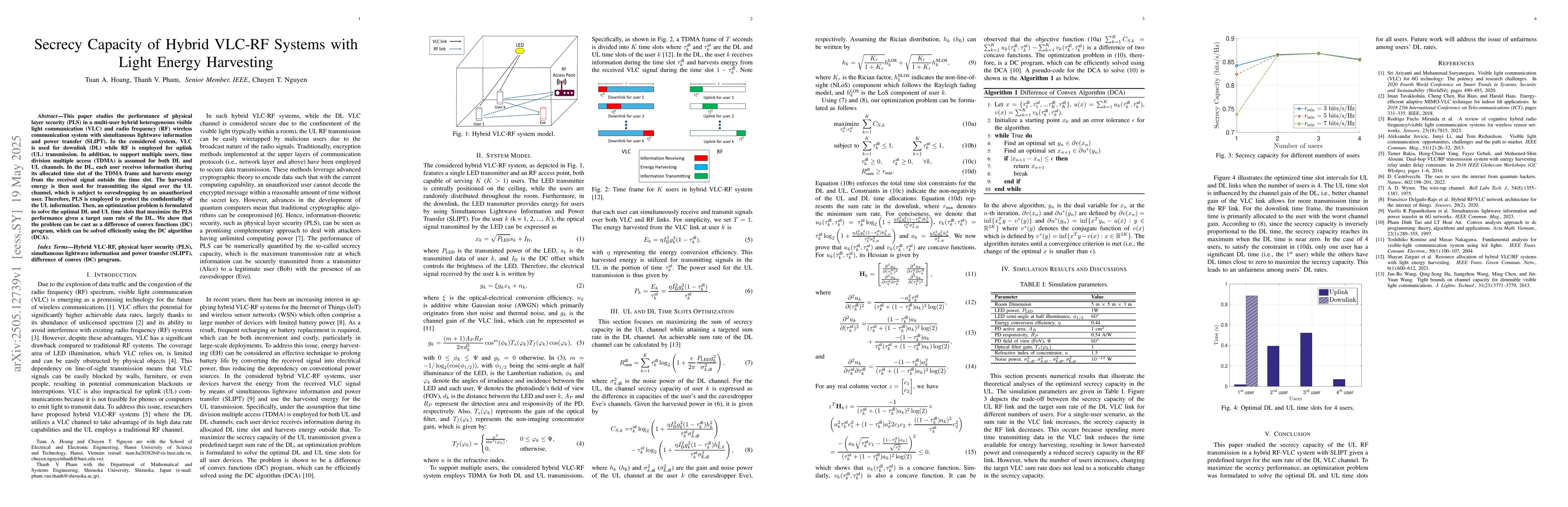 The paper presents a method to optimize hybrid VLC-RF systems using PLS, formulating the problem as a DC program solvable by DCA.
