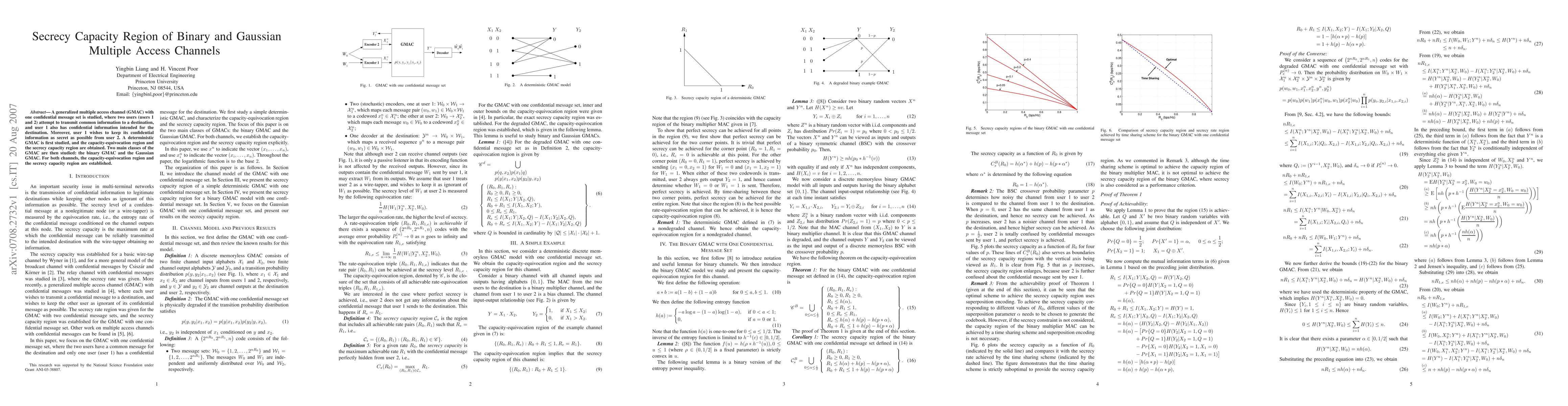 A generalized multiple access channel (GMAC) with one confidential message set is studied, where two users (users 1 and 2) attempt to transmit common information to a destination, and user 1 also has confidential information intended for the destination. Moreover, user 1 wishes to keep its confidential information as secret as possible from user 2. A deterministic GMAC is first studied, and the capacity-equivocation region and the secrecy capacity region are obtained. Two main classes of the GMAC are then studied: the binary GMAC and the Gaussian GMAC. For both channels, the capacity-equivocation region and the secrecy capacity region are established.