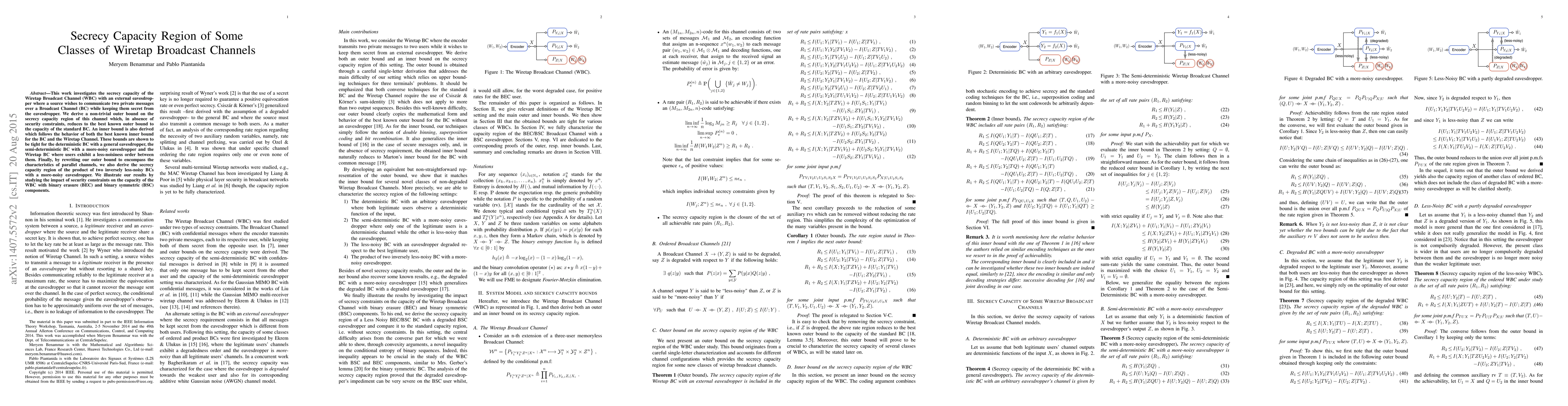 The paper investigates the secrecy capacity of the Wiretap Broadcast Channel (WBC) with an external eavesdropper, deriving outer and inner bounds for its secrecy capacity region. It validates these bounds through specific channel models.