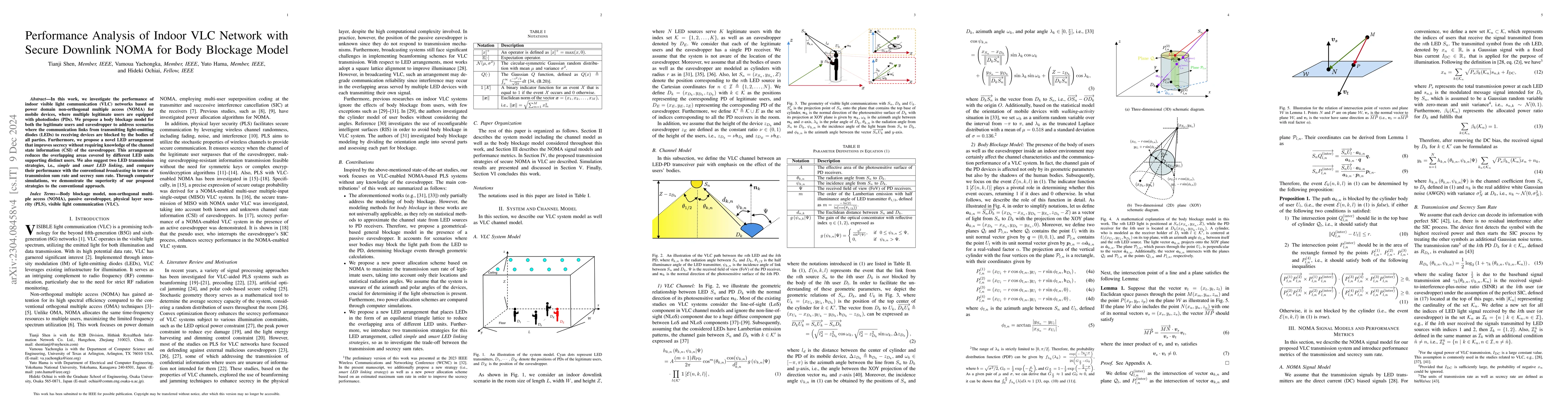This paper explores indoor visible light communication (VLC) networks using non-orthogonal multiple access (NOMA) for mobile devices, focusing on secrecy and transmission sum rates. It introduces a body blockage model and proposes novel LED arrangements and operation strategies to enhance secrecy without eavesdropper channel state information, demonstrating improved performance through simulations.