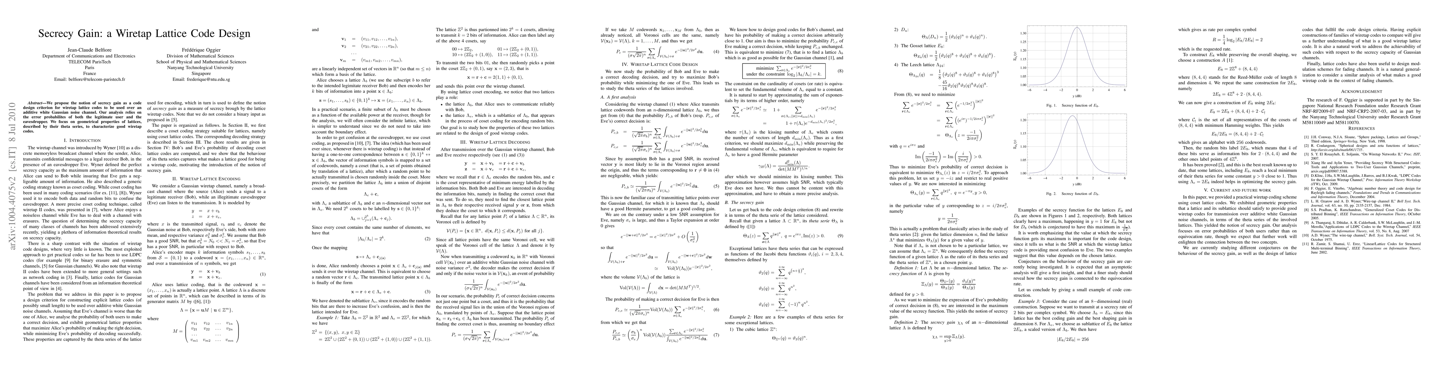 This paper introduces secrecy gain as a criterion for designing wiretap lattice codes over additive white Gaussian noise channels, emphasizing the geometrical properties of lattices and their theta series to optimize performance for both legitimate users and eavesdroppers.