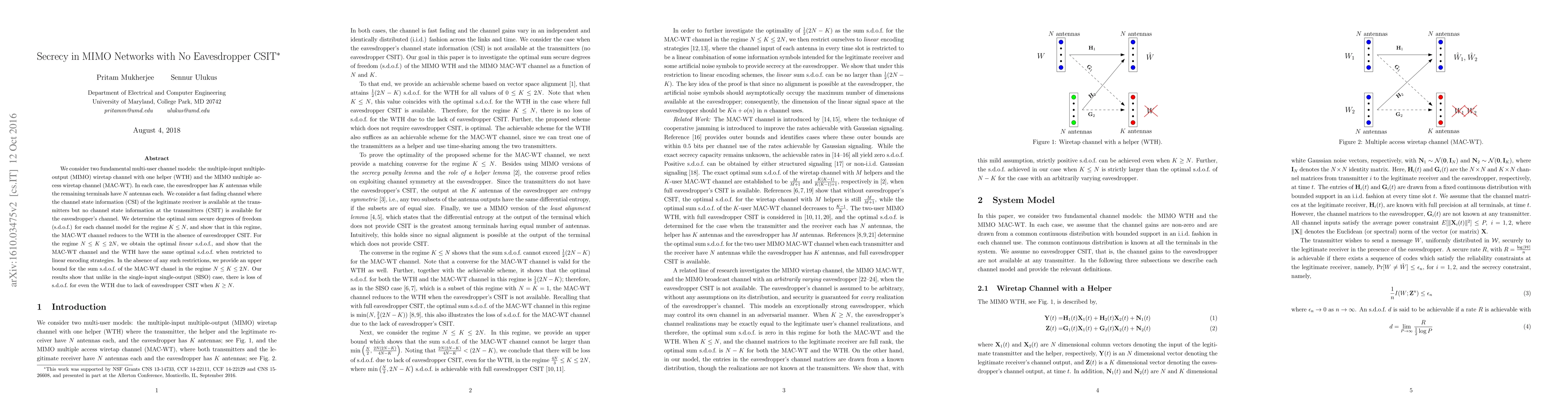 We consider two fundamental multi-user channel models: the multiple-input multiple-output (MIMO) wiretap channel with one helper (WTH) and the MIMO multiple access wiretap channel (MAC-WT). In each case, the eavesdropper has $K$ antennas while the remaining terminals have $N$ antennas each. We consider a fast fading channel where the channel state information (CSI) of the legitimate receiver is available at the transmitters but no channel state information at the transmitters (CSIT) is available for the eavesdropper's channel. We determine the optimal sum secure degrees of freedom (s.d.o.f.) for each channel model for the regime $K\leq N$, and show that in this regime, the MAC-WT channel reduces to the WTH in the absence of eavesdropper CSIT. For the regime $N\leq K\leq 2N$, we obtain the optimal linear s.d.o.f., and show that the MAC-WT channel and the WTH have the same optimal s.d.o.f. when restricted to linear encoding strategies. In the absence of any such restrictions, we provide an upper bound for the sum s.d.o.f. of the MAC-WT chanel in the regime $N\leq K\leq 2N$. Our results show that unlike in the single-input single-output (SISO) case, there is loss of s.d.o.f. for even the WTH due to lack of eavesdropper CSIT when $K\geq N$.