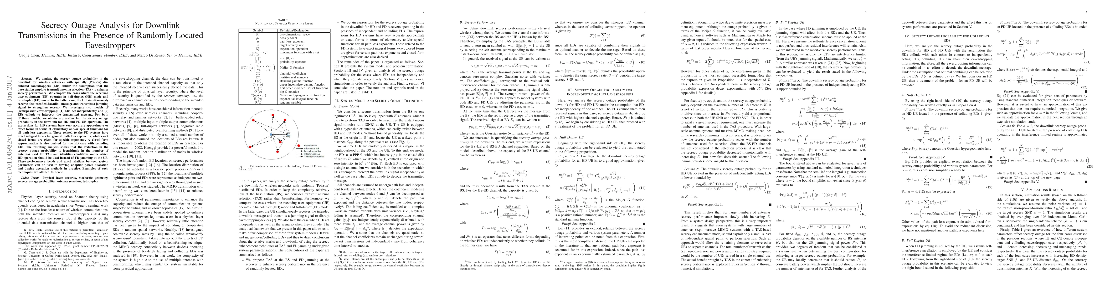 This paper analyzes the secrecy outage probability in downlink wireless networks with randomly located eavesdroppers under transmit antenna selection, comparing half-duplex and full-duplex modes. It derives expressions for secrecy outage in both modes for independent and colluding eavesdroppers, showing that HD operation is preferable under certain conditions.